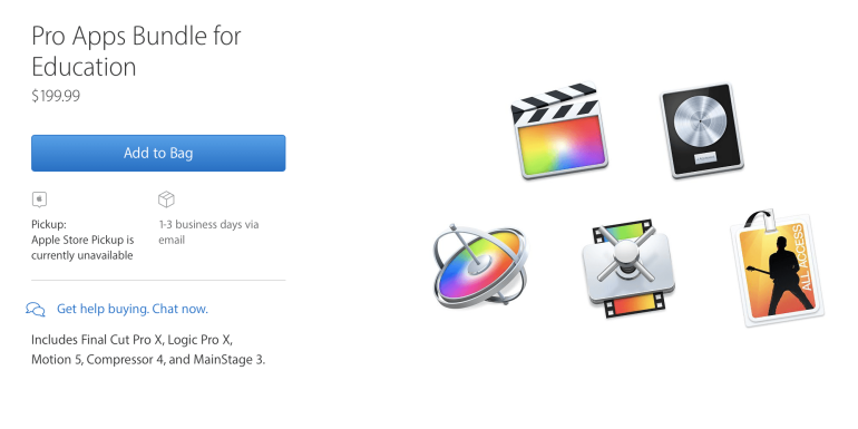 Apple จัดโปรโมชั่นพิเศษสำหรับนักศึกษา โดยมัดรวมแอปพลิเคชั่นสำหรับ Mac ระดับโปรถึง 5 แอปในราคา $199 จากราคาเต็มรวม $629 ได้แก่ Final Cut Pro X, Logic Pro X, Motion 5, Compressor 4, และ MainStage 3วัชรกุล พัฒนาประทีป | 3262 days ago