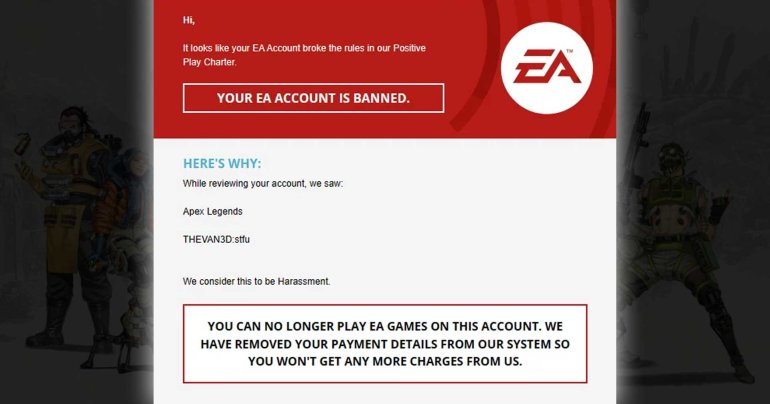 รายงานเผยมีผู้เล่น Apex Legends พากันวิจารณ์ Electronic Arts (EA) หลังจากพบผู้เล่นชื่อว่า THEVAN3D ถูกแบนจากเกม 'ถาวร' เพียงแค่พิมพ์คำว่า STFU หรือ Shut The F*ck Up (คำสบถที่ใช้สั่งให้คนที่คุยด้วยหุบปาก) ผ่านช่องแชตของเกมกรณ์รัฐภาส ธนวัตไชยศรี | 784 days ago