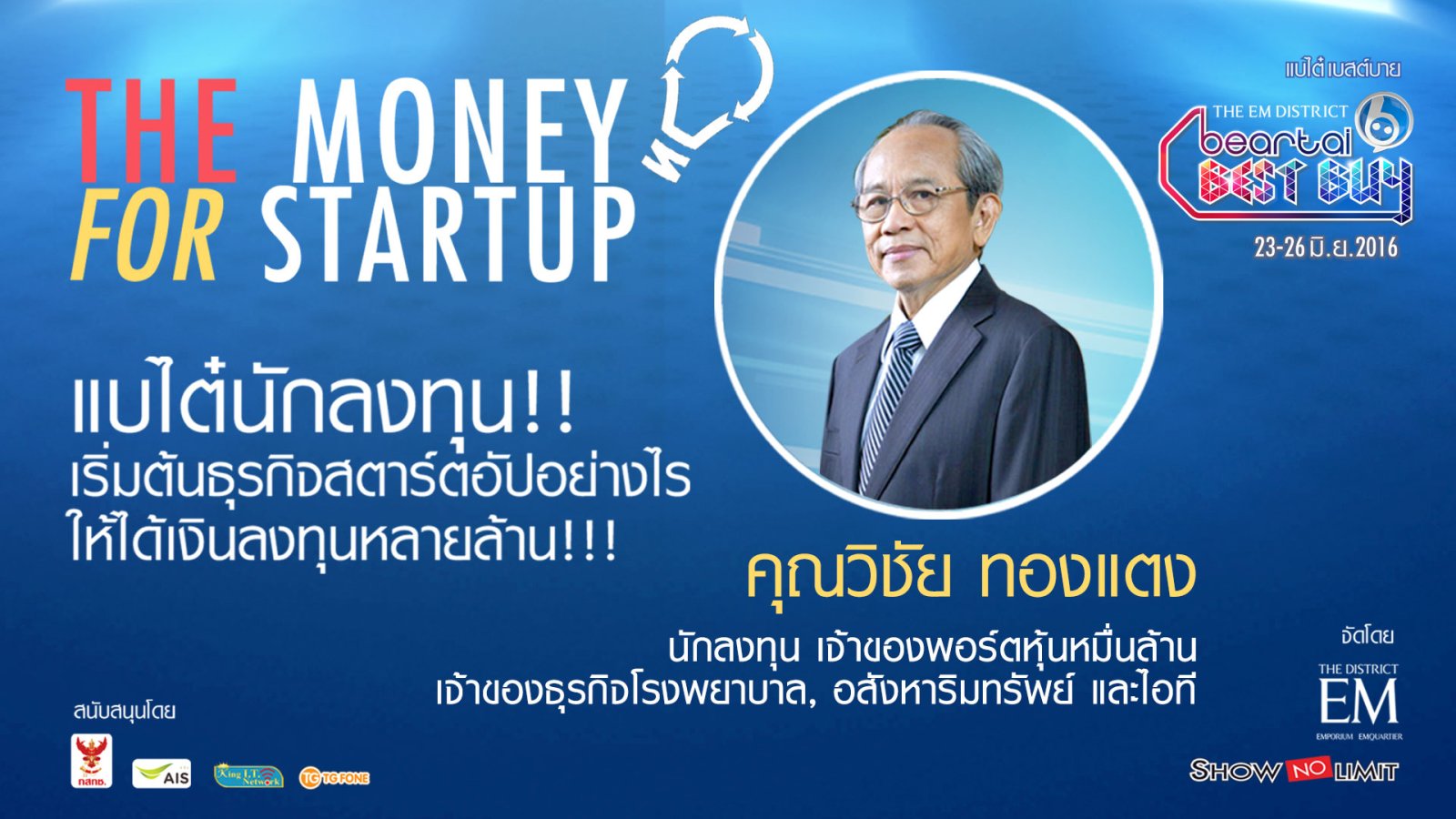 ประเดิมช่วง The Money for Startup ในงาน Beartai Best Buy วันแรก วันพฤหัส ที่23 มิถุนายน 2559 ด้วยการพูดคุยกับ คุณวิชัย เบญจรงคกุล มหาเศรษฐีนักลงทุน ถึงแนวคิดการลงทุนในธุรกิจ StartUp ว่าอะไรที่เป็นเรื่องสำคัญที่ควรพิจารณาในการลงทุนในธุรกิจ Start-Up บ้าง เพราะกว่าจะประสบผลสำเร็จได้นั้นก็ต้องใช้ทั้งแรงงาน และแรงเงิน https://www.facebook.com/beartai/videos/1231860320180379/ คุณวิชัย เบญจรงคกุล เป็นนักลงทุนในระบบสื่อสารโทรคมนาคมในเมืองไทยมายาวนานกว่า 30 ปี ปัจจุบันดำรงตำแหน่งเป็นกรรมการผู้จัดการที่ บริษัท เบญจจินดา โฮลดิ้ง อันเป็นธุรกิจของครอบครัว ที่ประกอบกิจการมาตั้งแต่รุ่นคุณพ่อของคุณวิชัยเอง ซึ่ง คุณวิชัย เบญจรงคกุล กล่าวว่า "ณ ตอนนี้ธุรกิจ Start-Up นั้นค้ลายกับ ๆ ดิจิทัล ทีวี คือกำลังอยู่ในช่วงที่แพร่พันธุ์เยอะ จึงน่าจะมี Start-Up คลับ เพื่อมารองรับและชูจุดเด่นของผลิตภัณท์หรือบริการเดียวกันที่เป็นที่สุดของ Start-Up นั้น ๆ และรวมให้เป็นหนึ่งบริการ เพราะสิ่งที่สำคัญคือการเรียนรู้ที่จะอยู่ร่วมกันของหุ้นส่วนและพาร์ทเนอร์ แอพฯใหญ่ ๆ ที่สำเร็จในโลกนี้แรก…salinee tintumrong | 3499 days ago