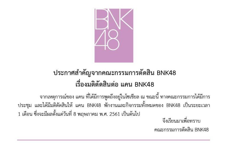 จากกระแสออนไลน์ ในช่วงหัวค่ำของวันที่ 7 พ.ค.61 ที่ผ่านมากรณีมีผู้นำภาพถ่าย selfie ของน้อง แคน BNK48 มาเผยแพร่ จนเป็นที่วิพากษ์วิจารณ์กันอย่างกว้างขวางไปแล้วนั้น วันรุ่งขึ้น 8 พ.ค.61 ช่วงบ่าย แคนแคน BNK48 ไลฟ์สดชี้แจงกรณีภาพหลุด ช่วงหัวค่ำในวันเดียวกัน เพจ BNK48 ก็ออกมาประกาศดังนี้ ประกาศสำคัญจากคณะกรรมการตัดสิน BNK48 เรื่องมติตัดสินต่อ แคน BNK48 จากเหตุการณ์ของ แคน ที่ได้มีการพูดถึงอยู่ในโซเชียล ณ ขณะนี้ ทางคณะกรรมการได้มีการประชุม และได้มีมติตัดสินให้ แคน BNK48 พักงาน และกิจกรรมทั้งหมดของ BNK48 เป็นระยะเวลา 1 เดือน ซึ่งจะมีผลตั้งแต่วันที่ 8 พฤษภาคม พ.ศ. 2561 เป็นต้นไป https://www.facebook.com/bnk48official/photos/a.891767180950541.1073741830.842370685890191/1528989647228288/?type=3&theater ทั้งนี้การพักงานดังกล่าวจะส่งผลกระทบกับโอตะของ แคน BNK48 ที่ต้องการจะมางานจับมือ BNK48 3rd Single…Meechok Dechpokasup | 2831 days ago