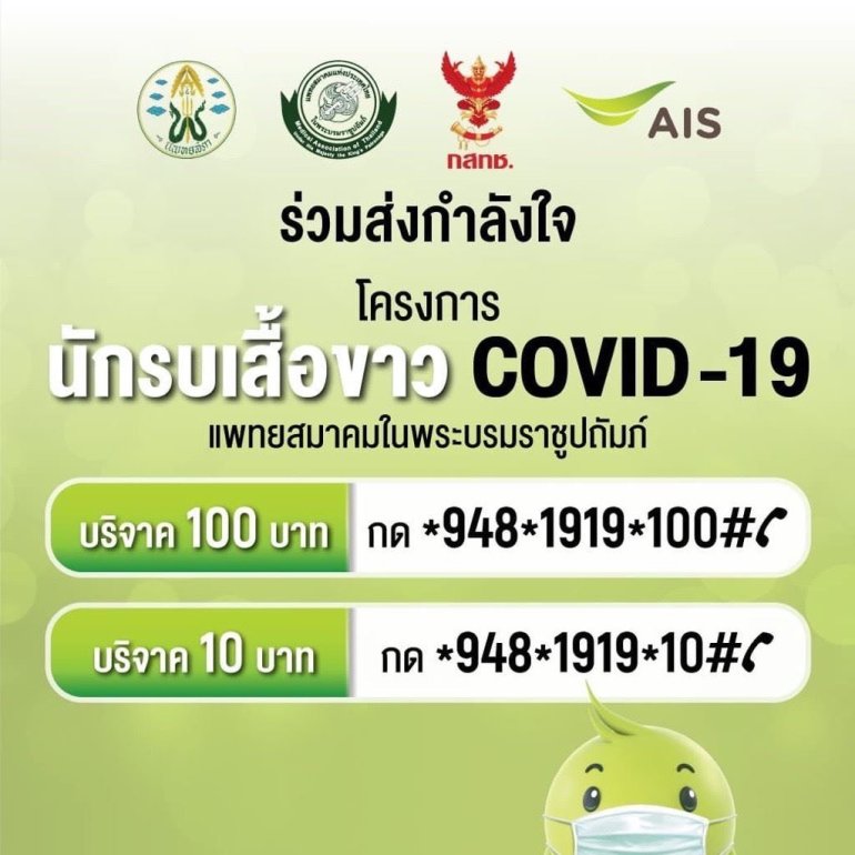 จากสถานการณ์แพร่ระบาดของเชื้อไวรัส COVID-19 ในประเทศไทย ล่าสุด AIS (เอไอเอส) ขอร่วมเป็นส่วนหนึ่งของการเป็นช่องทางให้คนไทยร่วมส่งกำลังใจ ผ่านการบริจาคเงินให้แก่บุคลากรทางการแพทย์ผู้ปฏิบัติหน้าที่อย่างเสียสละ ภายใต้โครงการ “นักรบเสื้อขาว COVID-19 แพทยสมาคมในพระบรมราชูปถัมภ์” ในการสนับสนุนจากแพทยสภา แพทยสมาคมแห่งประเทศไทย สำนักงานคณะกรรมการกิจการกระจายเสียง กิจการโทรทัศน์ และกิจการโทรคมนาคมแห่งชาติ หรือ กสทช. โดยเปิดช่องทางให้คนไทยที่ใช้มือถือทุกเครือข่าย มีส่วนร่วมบริจาคเงินได้ง่ายๆ ผ่าน USSD เพื่อร่วมสนับสนุนการปฏิบัติหน้าที่ของแพทย์ พยาบาล และเจ้าหน้าที่ด้านสาธารณสุขทุกระดับ ที่กำลังทุ่มเทแรงกาย แรงใจอย่างหนัก ในการต่อสู้กับโรคร้ายซึ่งมีแนวโน้มที่จะมีจํานวนผู้ป่วยเพิ่มขึ้นต่อเนื่อง สำหรับลูกค้าเอไอเอส สามารถบริจาคเงินได้ง่ายๆ ผ่าน 2 ช่องทาง ดังนี้ บริจาค 100 บาท กด *948*1919*100# แล้วโทรออก บริจาค 10 บาท กด *948*1919*10# แล้วโทรออก นายปรัธนา ลีลพนัง หัวหน้าคณะผู้บริหารกลุ่มลูกค้าทั่วไป เอไอเอส กล่าวว่า “นอกจากคนไทยทุกคนจะมีส่วนช่วยยับยั้งการแพร่ระบาดของเชื้อไวรัส โดยเพิ่มระยะห่างทางสังคม หรือ…กองบรรณาธิการ BT | 2127 days ago