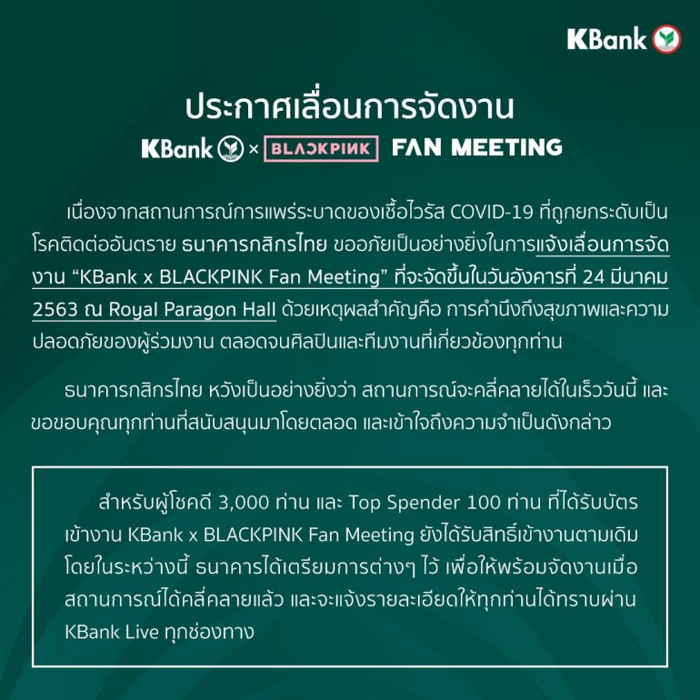 ธนาคารกสิกรไทย ประกาศเลื่อนการจัดงาน KBank x BLACKPINK Fan Meeting