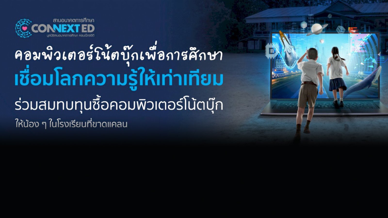 01/12/2021นักเรียนในเมืองมีโอกาสเข้าถึงอุปกรณ์ดิจิทัลได้มากกว่าคนอื่นเขา การใช้อุปกรณ์ดิจิทัลสามารถเข้าถึงแหล่งความรู้ได้ทั่วโลกที่สำคัญสะดวกและรวดเร็วอีกด้วย แต่ในปัจจุบันประเทศไทยยังมีนักเรียนกว่า 2.6 แสนคนที่ขาดโอกาสในการเรียนรู้ เพียงเพราะไม่มีอุปกรณ์ดิจิทัล แบไต๋อยากเชิญชวนร่วมบริจาคสมทบทุนซื้อคอมพิวเตอร์โน้ตบุ๊กให้น้อง ๆ ในโรงเรียนคอนเน็กซ์อีดีที่ขาดแคลนทั่วประเทศ เพื่อเชื่อมโลกความรู้ให้เท่าเทียม บริจาคตรงถึงโรงเรียนได้ที่ connexted.org