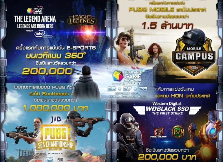 ใกล้เข้ามาทุกขณะกับมหกรรมเกมที่ยิ่งใหญ่ที่สุดแห่งเอเชียตะวันออกเฉียงใต้ THAILAND GAME SHOW 2018 ปีนี้จะมาพร้อมกับการแข่งขันอีสปอร์ตสุดเดือด จัดหนัก จัดเต็ม ทั้ง 4 รายการด้วยกัน ชิงเงินรางวัลรวมทั้งสิ้นหว่า 2.9 ล้านบาท !! จะมีรายการแข่งขันอะไรบ้าง มาดูกันเลย !! การแข่งขันTHE LEGEND ARENA: Legends are born here powered by Intel เป็นการแข่งขันอีสปอร์ตเกม MOBA สุดฮิตอย่าง League of Legends บนเวทีแบบ 360 องศาใจกลางฮอลล์ชิงเงินรางวัลกว่า 200,000 บาท โดยมีผู้เข้าแข่งขันทั้งหมดจากทั่วประเทศที่ฟาดฟันจนได้เข้ามาสู่รอบชิงชนะเลิศเพื่อขึ้นสังเวียนเฟ้นหาสุดยอดซัมมอนเนอร์ (Summoner) แชมป์ประเทศไทยในงาน THAILAND GAME SHOW 2018 งานนี้รับประกันความมันส์ทั้งผู้แข่งขัน และสาวกเกมLeague of Legends ที่จะมาร่วมเชียร์กันสนั่นอารีน่า ติดตามรายละเอียดการแข่งขันได้ที่ http://intel.byg.in.th/ การแข่งขัน PUBG Mobile ระดับมหาวิทยาลัยชิงแชมป์ประเทศไทย…Totsapon Kritsadangphorn | 2655 days ago