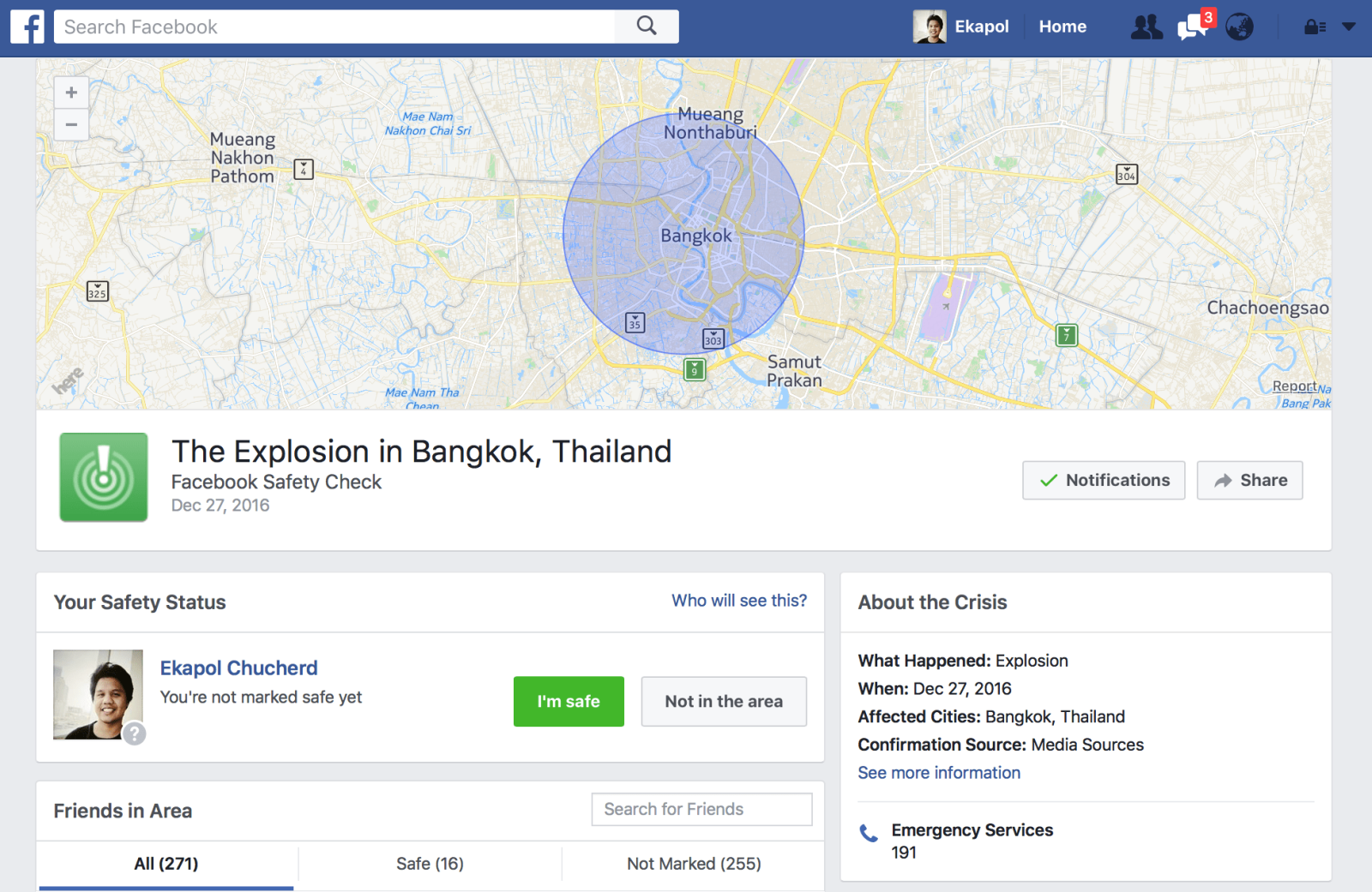 28/12/2016หลังเฟซบุ๊กทำคนไทยทั้งกรุงเทพแตกตื่นว่าเกิดเหตุระเบิดในกรุงเทพมหานคร จนเปิดระบบ Facebook Safety Check เพื่อยืนยันความปลอดภัยของผู้ใช้ในช่วงคืนวันที่ 27 ธันวาคม ล่าสุดฝ่ายประชาสัมพันธ์ของเฟซบุ๊กประเทศไทยชี้แจงการแจ้งเตือนในไทยนั้นถูกต้องแล้ว โดยอ้างอิงเหตุการณ์ขว้างระเบิดปิงปองที่ทำเนียบวานนี้ และเป็นการเปิดใช้ระบบแจ้งเตือนโดยบุคคลที่สาม ไม่ใช่ทางเฟซบุ๊กเอง
