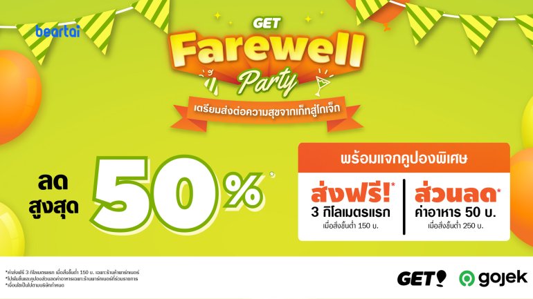 GET เปิดแคมเปญ “GET Farewell Party” ก่อนเปลี่ยนแบรนด์เป็น Gojek ยกขบวนร้านอาหารดังลดสูงสุด 50% แถมโปรค่าส่งฟรี!