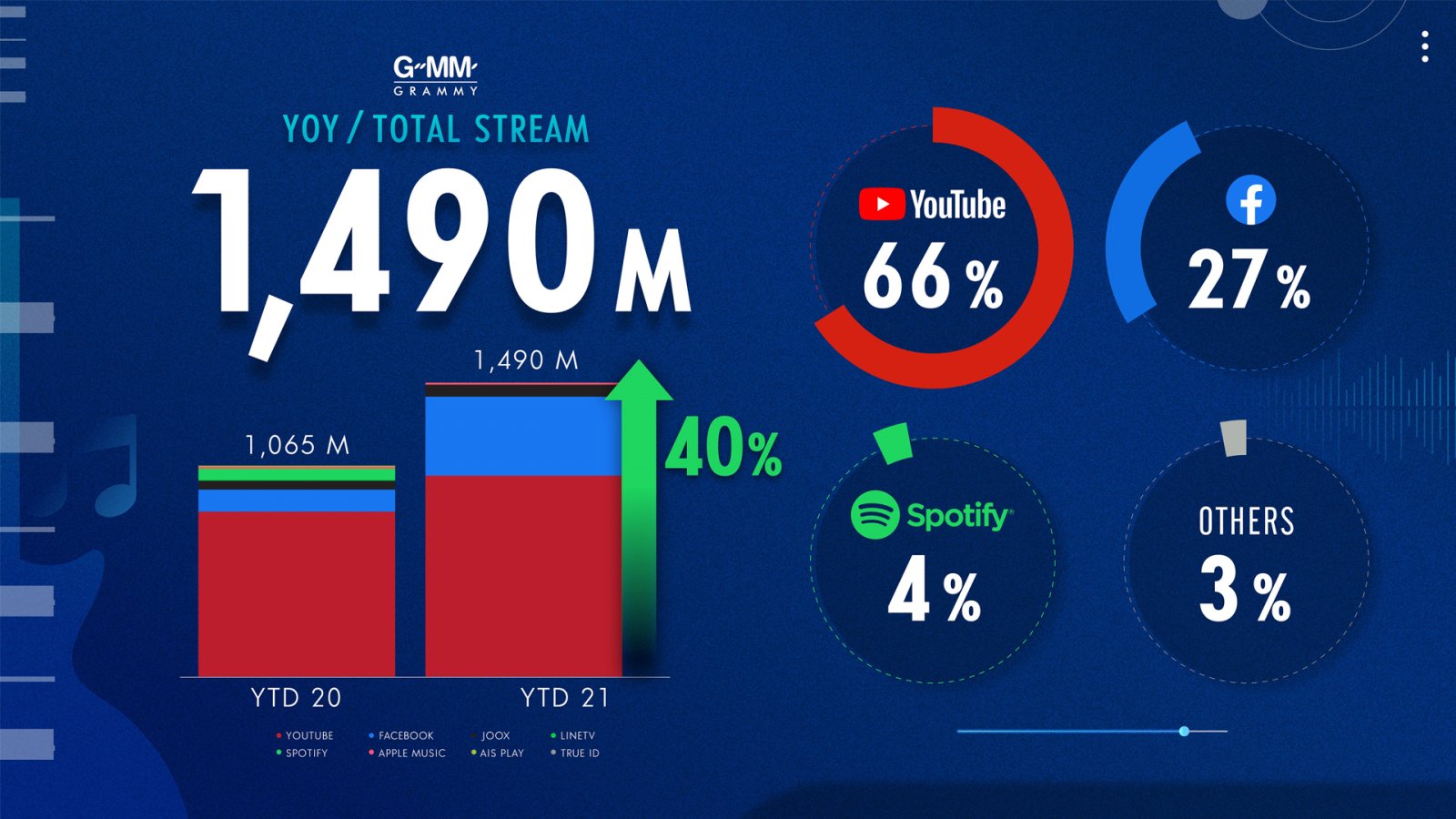 17/03/2021จีเอ็มเอ็ม มิวสิค พิสูจน์ความสำเร็จอีกครั้ง ด้วยการก้าวสู่ผู้นำตลาดเพลงไทย ทุกแพลตฟอร์ม เฉพาะเดือนม.ค. 2564 ยอดวิวพุ่งทุบสถิติกว่า 1,400 ล้านสตรีม เพิ่มขึ้น 40% ในช่องทางเฟซบุ๊คเพิ่มกว่า 2 เท่าตัว ครอบคลุมตลาดทุกเซกเมนต์ทั้งเพลงป็อบ ร็อค และลูกทุ่ง ย้ำตลาดเพลงไทยยังไม่ตาย พร้อมเดินหน้าแผนบันได 7 ขั้นสู่การเติบโตในอนาคต นายภาวิต จิตรกร ประธานเจ้าหน้าที่บริหารสายธุรกิจ จีเอ็มเอ็ม มิวสิค บริษัท จีเอ็มเอ็ม แกรมมี่…