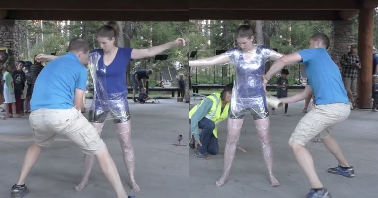 สามีใช้ม้วนพลาสติกห่อภรรยาได้เร็วที่สุดในโลก ทุบสถิติ Guinness ของตัวเอง