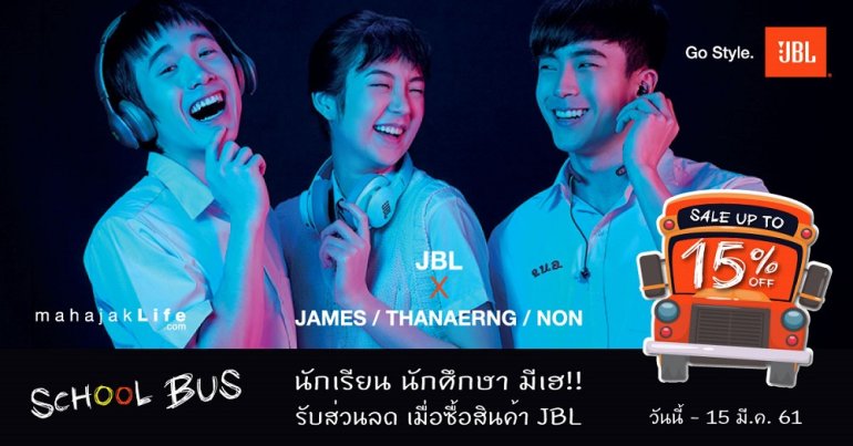 นน เจมส์ ต้าเหนิง JBL Brand Ambassadors ยกขบวนความสนุกในการฟัง นักเรียน นักศึกษา เตรียมเฮ!! Go Style ไปกับ นน เจมส์ ต้าเหนิง เตรียมพร้อม Back To School ยกขบวน School Bus นำความสุขสนุกกับการฟังไปถึงที่โรงเรียนของคุณอย่างใกล้ชิด เพื่อให้เสียงเพลงที่คุณได้ฟังแฮปปี้มากกว่าเดิม ด้วยการใช้สิทธิ์สุดพิเศษรับส่วนลดทันที 15% เมื่อซื้อสินค้า JBL สำหรับน้องๆ นักเรียน นักศึกษา ตั้งแต่วันนี้ - 15 มี.ค. 61 ดูรายละเอียดเพิ่มเติมได้ที่ https://goo.gl/du5c3Z เงื่อนไข เพียงแสดงบัตรนักเรียน นักศึกษา ณ จุดขาย เพื่อรับสิทธิ์ ( 1 บัตรใช้ได้ 2 สิทธิ์ ) เฉพาะสินค้า JBL ราคาปกติที่ร่วมรายการ สอบถามรายละเอียดโปรโมชั่นเพิ่มเติม…salinee tintumrong | 2917 days ago