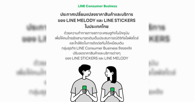 แฟนสติกเกอร์ เมโลดี้ มีเฮ!!! กลุ่มธุรกิจ LINE Consumer Business ประกาศปรับลดราคา LINE STICKERS และ LINE MELODY ที่ขายผ่านทุกช่องทาง ตอบรับความท้าทายทางเศรษฐกิจ มุ่งให้คนไทยสามารถเติมเต็มดิจิทัลไลฟ์สไตล์ สร้างสีสันการสื่อสารผ่าน LINE ได้อย่างมีความสุขกว่าเดิม07/06/2022