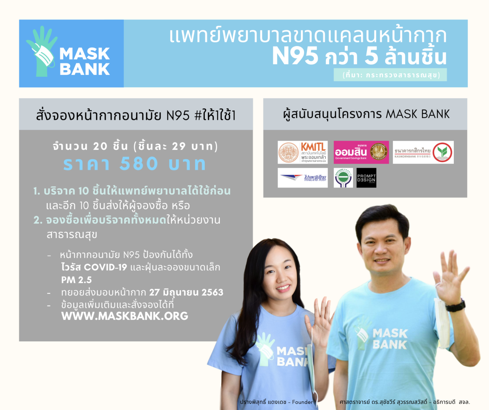 เปิดตัว Mask Bank โครงการธนาคารหน้ากากระดมทุนสาธารณะและรับบริจาคเพื่อจัดหาหน้ากากอนามัย ให้ประชาชนจองซื้อได้ในราคาชิ้นละ 2.50 บาทไม่จำกัดจำนวนตามความจําเป็นที่ต้องใช้จริงส่งถึงบ้านฟรีทุกเดือน โดยให้ซื้อใช้เองพร้อมซื้อบริจาคในสัดส่วน1ต่อ1 เพื่อสร้างสังคมแห่งการแบ่งปัน ภายใต้แคมเปญการรณรงค์ #หน้ากาก2บาท50มีจริงส่งถึงบ้าน #ใช้1ให้1 #get1give1 นางสาวปรางพิสุทธิ์ แดงเดช (ฟ้า) นักเดินทางและผู้ก่อตั้ง Play with Robot จับมือกับเภสัชกรหญิง นางสาว สิรีธร ลีห์อร่ามวัฒน์ (บิ๊นท์) นางสาวไทยปี 2562 และมิสอินเตอร์เนชั่นแนล 2019 ร่วมกันก่อตั้งโครงการธนาคารหน้ากากแห่งแรกของโลก เพื่อเป็นการบรรเทาปัญหาการขาดแคลนหน้ากากอนามัย ปัญหาการกักตุนสินค้า และหยุดการถูกเอารัดเอาเปรียบของประชาชนที่ต้องซื้อหน้ากากอนามัยในราคา แพงจากผู้ค้าที่ฉวยโอกาสขึ้นราคาอย่างไม่เป็นธรรม ขณะที่ความต้องการใช้หน้ากากอนามัยของประชาชนมีแนวโน้มสูงขึ้นจากภาวะการแพร่กระจายของเชื้อไวรัสโควิด-19 ที่มียอดผู้ติดเชื้อในประเทศเพิ่มมากขึ้นทุกวัน และคาดว่าปัญหาการขาดแคลนหน้ากากอนามัยจะทวีความรุนแรงตามไปด้วย หากการระบาดของไวรัสในประเทศไทยเข้าสู่ระดับ 3 ยิ่งจำนวนผู้ติดเชื้อขยายวงกว้างออกไปมากเท่าใด การสวมหน้ากากอนามัยเพื่อป้องกันตัวเอง และการรักษาระยะห่างทางสังคม (Social Distancing) ก็จะยิ่งมีความจำเป็นมากขึ้น จากความจำเป็นในการใช้หน้ากากอนามัยเพื่อป้องกันตัวเองจากโรคอุบัติใหม่ไวรัสโควิด-19 ของประชาชน ทำให้เกิดการกักตุนหน้ากากอนามัย ทั้งแบบธรรมชาติ คือกลัวไม่มีหน้ากากใช้จึงกักตุนไว้ และการกักตุนแบบไม่เป็นธรรมชาติ คือการกักตุนของผู้ค้าเพื่อหวังทำกำไรจากภาวะสินค้าขาดตลาด เพราะเมื่อสินค้าขาดตลาดก็จะขายได้ราคาแพงหลายเท่า ทำให้กลไกตลาดเสียสมดุล กอร์ปกับการผลิตหน้ากากอนามัยที่เดิมผลิตเพื่อการใช้งานในส่วนงานสาธารณสุขเป็นหลัก…ทีมคอนเทนต์ BT | 2180 days ago
