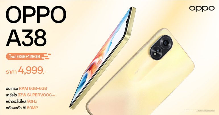 OPPO A38 รุ่นใหม่ อัปความจุจัดเต็มด้วย RAM 6GB เพิ่มหน่วยความจำได้อีก 6GB พร้อม ROM 128GB