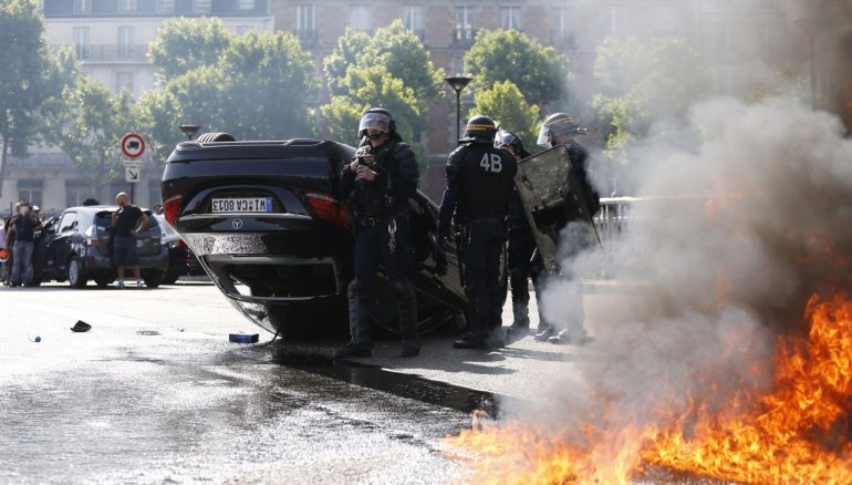 ลุกเป็นไฟ คนขับแท็กซี่ในปารีสปิดถนน คว่ำรถ เผายางประท้วง Uber!