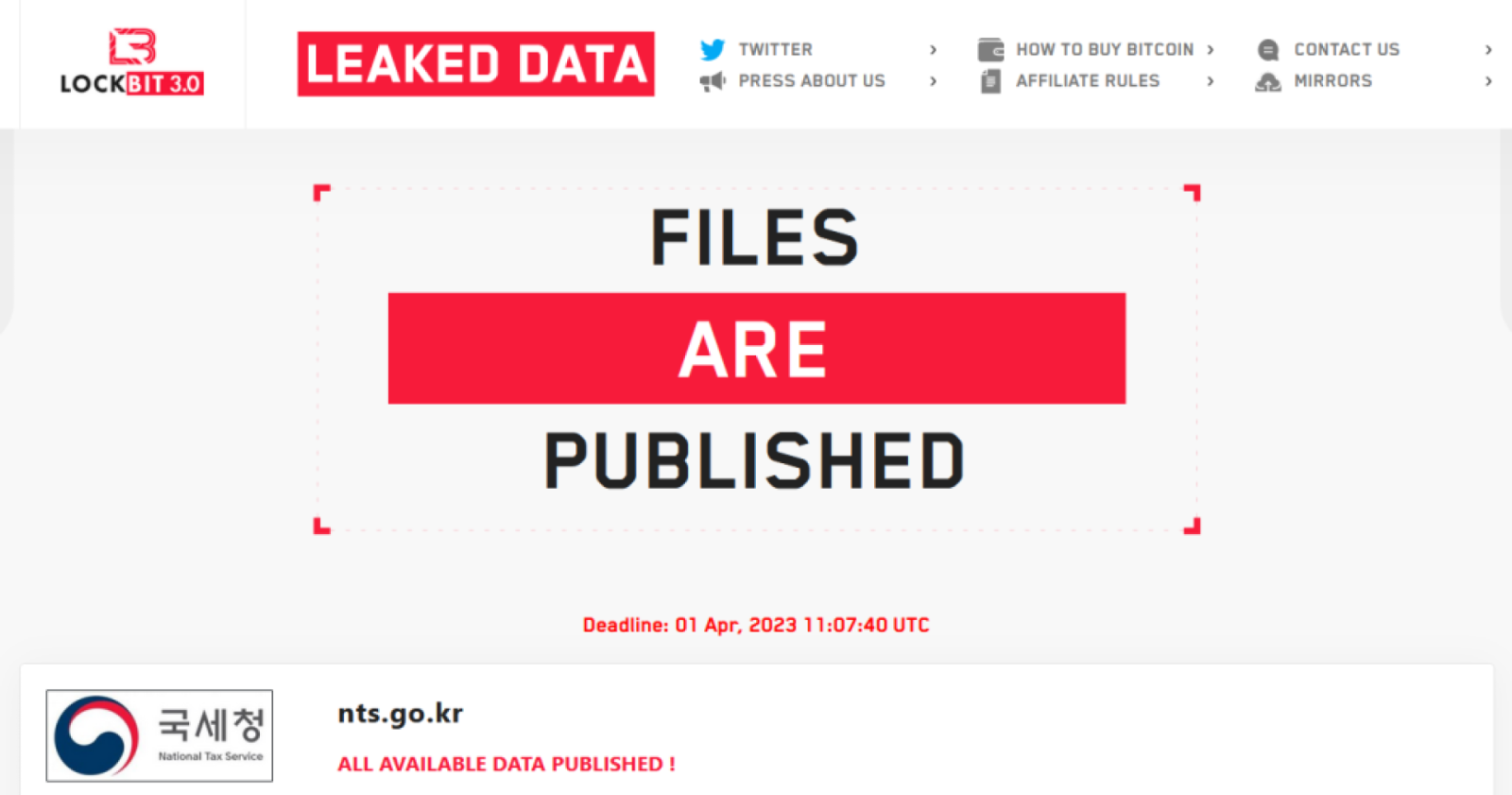 แก๊งมัลแวร์เรียกค่าไถ่ LockBit เผยว่าได้แฮกสำนักงานภาษีแห่งชาติของเกาหลีใต้ (NTS) บนเว็บไซต์ Tor ของทางกลุ่มตั้งแต่เมื่อวันที่ 29 เมษายนที่ผ่านมา