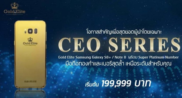 ปล่อยแล้ว! อีก 1 ความพิเศษสำหรับเหล่าผู้บริหารโดยเฉพาะที่เรียกได้ว่าต้องเหลียวมอง กับมือถือทองคำรุ่นพิเศษ CEO Series by Gold Elite x Dtac รุ่น Samsung Galaxy S8+ หรือ Samsung Galaxy Note 8 พร้อมเบอร์ตอง 5 หลักสุดล้ำ XXXXX และเบอร์เสริมดวงด้วย Lucky Number จาก หมอช้าง รวม 2 เบอร์ พร้อม Promotion ค่า Net , โทร Go No Limit จาก Dtac ฟรี 2-3 ปี รวมมูลค่ากว่า 500,000.- ในราคาสุดพิเศษ คุ้มกว่านี้ไม่มีอีกแล้ว หลังจากเปิดวางจำหน่ายไปเพียงวันเดียวมีผู้จองไปแล้วกว่า 40 เครื่อง! ซึ่งเรียกได้ว่าโปรโมชั่นนี้เป็นความร่วมมือระหว่างทาง Gold Elite นำโดยคุณมาร์ค…Totsapon Kritsadangphorn | 3045 days ago