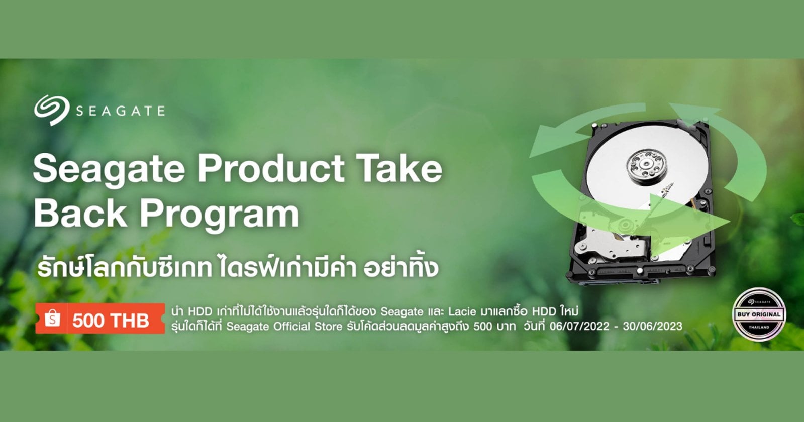 06/07/2022ซีเกท เทคโนโลยี โฮลดิ้งส์ (NASDAQ: STX) หนึ่งในผู้นำโซลูชั่นด้านการจัดเก็บข้อมูลของโลกเปิดตัวโครงการรับคืนสินค้าเก่าของซีเกท (Seagate Product Take Back Programme) ในประเทศไทย ซึ่งโครงการนี้เป็นส่วนหนึ่งของโครงการริเริ่มเพื่อความยั่งยืนโดยมุ่งหวังที่จะลดปริมาณขยะฮาร์ดไดรฟ์ที่ไม่ใช้งานแล้วในประเทศ
