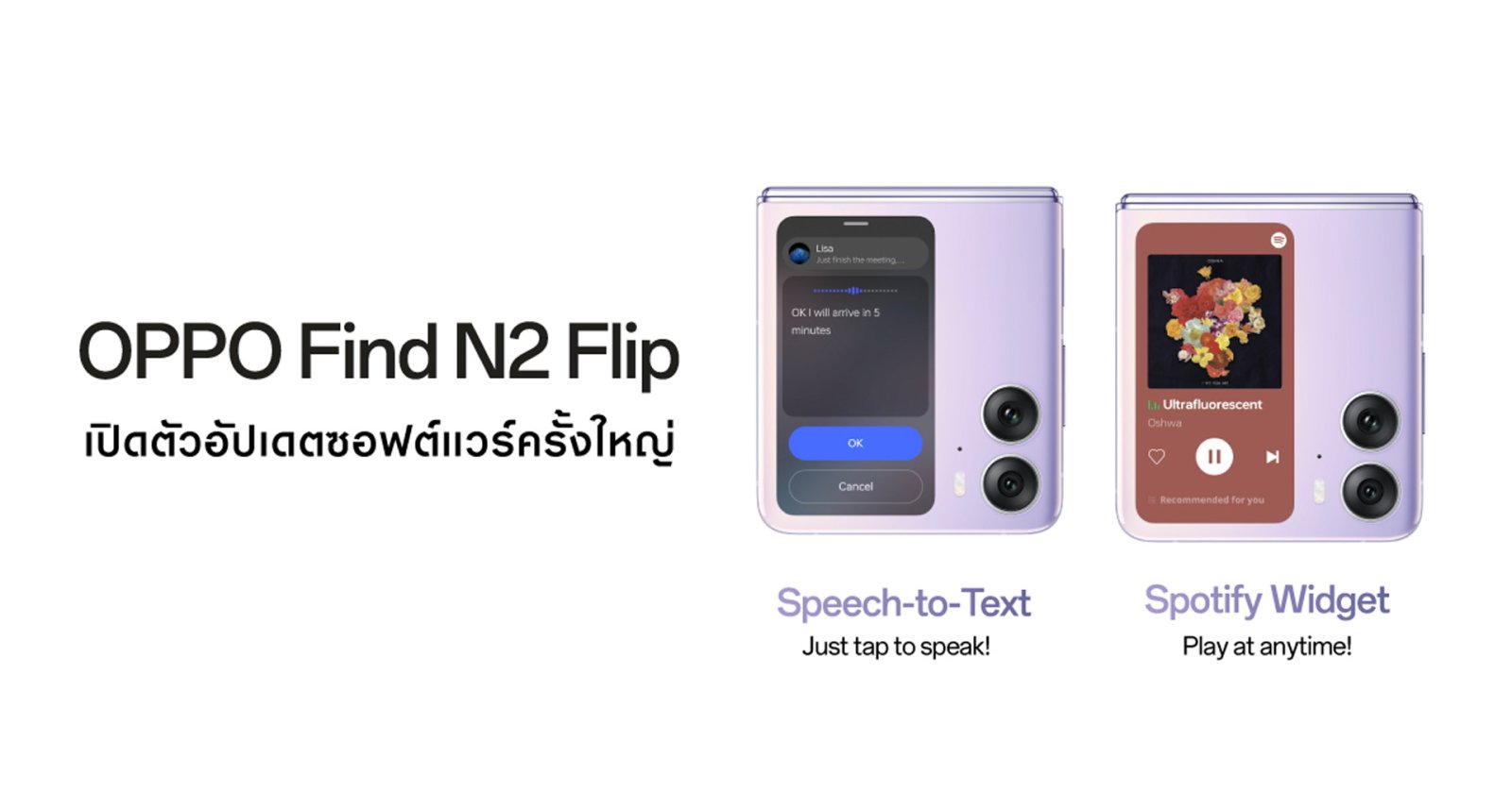 19/04/2023OPPO ประกาศเปิดตัวการอัปเดตซอฟต์แวร์ครั้งใหญ่สำหรับสมาร์ตโฟนจอพับรุ่นแฟลกชิปอย่าง OPPO Find N2 Flip ซึ่งมาพร้อมการพัฒนาฟังก์ชันการทำงานของหน้าจอด้านนอกให้ดียิ่งขึ้น โดยเพิ่มวิดเจ็ต Spotify ใหม่ที่พัฒนาร่วมกันโดย OPPO และ Spotify เฉพาะสำหรับ OPPO Find N2 Flip ช่วยเพิ่มประโยชน์สูงสุดจากหน้าจอด้านนอกที่ใหญ่ที่สุดในบรรดาสมาร์ตโฟนจอพับ ให้ผู้ใช้สามารถเพลิดเพลินไปกับการควบคุมการเล่นอย่างเต็มรูปแบบ ปุ่มหัวใจ และการแนะนำเนื้อหาโดยไม่ต้องกางหน้าจออุปกรณ์ออก
