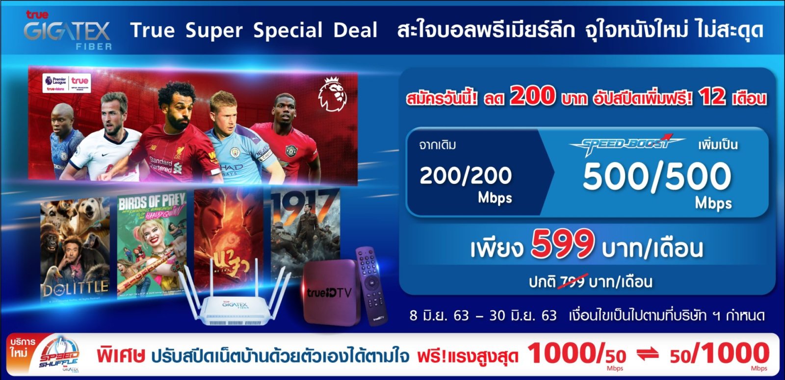 โปรพิเศษ เฉพาะช่องทางสมัครออนไลน์เท่านั้น สมัครทรูกิกะเทคไฟเบอร์ 200/200Mbps. เริ่มต้นเพียง 599 บาท/เดือน อัปสปีดเพิ่มให้ 500/500Mbps ฟรี นาน 12 เดือน พร้อมบริการสลับสปีด (Speed Shuffle) สูงสุด 1000/50Mbps และชมความบันเทิงระดับโลก ทั้งช่องดัง หนัง ยูทูป จาก TrueID TV รายละเอียด พิเศษ! สมัครแพ็กเกจ 200/200Mbps เพียง 599 บาท/เดือน (ลด 200 บาท นาน 12 เดือน)ฟรี! Speed Boost อัปสปีด เพิ่มฟรี! เป็น 500/500Mbps นาน 12 เดือน (โดยจะได้รับการอัปสปีดหลักจากติดตั้งสำเร็จภายใน 5 วันทำการ)ฟรี! Speed Shuffle บริการสลับสปีด ให้คุณปรับสปีดได้สูงสุดถึง 1000/50…21/11/2019
