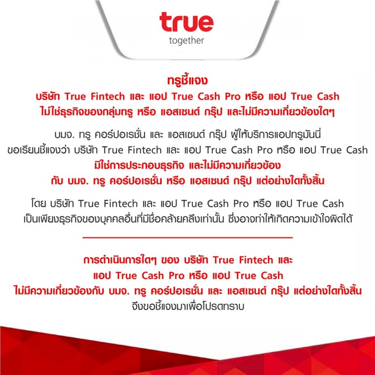 ตามที่มีข่าวการดำเนินคดี บจก.ทรู ฟินเทค และการจับกุมผู้เกี่ยวข้องกับการให้บริการแอปพลิเคชัน TRUE CASH PRO นั้น บมจ.ทรู คอร์ปอเรชั่น และแอสเซนด์ กรุ๊ป ผู้ให้บริการแอปพลิเคชัน ทรูมันนี่ ขอชี้แจงว่า TRUE CASH PRO เป็นแอปพลิเคชันเงินกู้นอกระบบที่ดำเนินการโดยกลุ่มนายทุนต่างชาติ ไม่ใช่การประกอบธุรกิจ และไม่มีความเกี่ยวข้องกับ บมจ.ทรู คอร์ปอเรชั่น หรือแอสเซนด์ กรุ๊ป แต่อย่างใดทั้งสิ้น โดย บจก.ทรู ฟินเทค แอปพลิเคชัน TRUE CASH PRO และแอปพลิเคชั่น TRUE CASH ก่อนหน้านี้ นั้น เป็นเพียงธุรกิจของบุคคลอื่นที่มีชื่อคล้ายคลึงเท่านั้น ซึ่งอาจทำให้ประชาชนเกิดความเข้าใจผิดได้ ทั้งนี้ การดำเนินการใดๆของ บจก.ทรู ฟินเทค แอปพลิเคชัน TRUE CASH PRO และแอปพลิเคชั่น TRUE CASH ไม่มีความเกี่ยวข้องกับ บมจ.ทรู คอร์ปอเรชั่น และแอสเซนด์…กองบรรณาธิการ BT | 2057 days ago