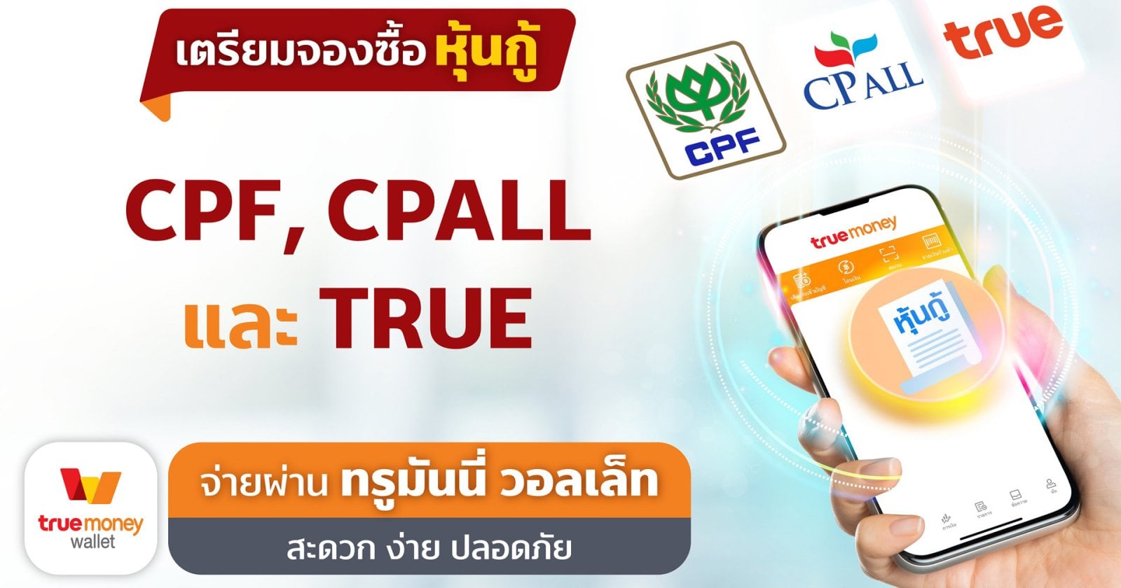 02/08/2022ทรูมันนี่ ผู้นำด้านบริการอิเล็กทรอนิกส์เพย์เมนท์และผู้ให้บริการทางการเงินชั้นนำในภูมิภาคเอเชียตะวันออกเฉียงใต้ ขยายบริการทางการเงินตอบโจทย์การลงทุนในยุคดิจิทัล โดยเตรียมเปิดให้นักลงทุนสามารถจองซื้อหุ้นกู้ในเครือเจริญโภคภัณฑ์ (CP Group) ได้แก่ บมจ. เจริญโภคภัณฑ์อาหาร (CPF), บมจ. ซีพี ออลล์ (CPALL) และ บมจ.ทรู คอร์ปอเรชั่น (TRUE) ผ่านแอปพลิเคชันทรูมันนี่ วอลเล็ท ในช่วงต้นเดือนสิงหาคม 2565 นี้