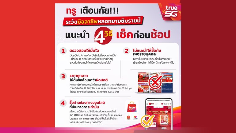 จากกรณีที่มีเหล่ามิจฉาชีพหลอกขายซิมมือถือทรูมูฟ เอช รายปี ราคาถูกผ่านช่องทางออนไลน์ ซึ่งเมื่อมีผู้เข้าใจผิดหลงเชื่อและได้ซื้อซิมมาใช้ แต่ไม่สามารถใช้งานได้ตามความเร็วที่ระบุไว้ และมีข้อความแจ้งให้เติมเงินเพื่อให้สามารถใช้งานต่อได้ อีกทั้งไม่สามารถติดต่อกลับช่องทางออนไลน์ดังกล่าวเนื่องจากถูกบล็อกการติดต่อและบางเพจได้ปิดหนีไปนั้น ทรู ขอแสดงความห่วงใยมายังผู้ใช้บริการที่ประสบปัญหา และเพื่อป้องกันไม่ให้เกิดเหตุการณ์ดังกล่าวกับผู้ใช้บริการรายอื่นอีก จึงขอประชาสัมพันธ์แนวทางเพื่อป้องกันการถูกหลอกลวงดังนี้ ตรวจสอบให้มั่นใจว่า เพจที่จะตัดสินใจซื้อออนไลน์นั้นมีชื่อบริษัท หรือชื่อร้านที่ชัดเจนและมีที่อยู่รวมทั้งช่องทางให้สามารถติดต่อกลับได้ไม่แนะนำให้ซื้อกับเพจรายบุคคล เพราะไม่มีหลักประกันที่จะไม่สามารถเรียกร้องใด ๆ ได้ เมื่อมีการปิดเพจหนีไปหากราคาซิมที่เสนอขายมีแพ็กเกจราคาที่ถูกมากกว่าท้องตลาด ให้ตั้งข้อสังเกตว่าเป็นเรื่องผิดปกติ อาจเข้าข่ายที่จะเป็นมิจฉาชีพ เช่น เสนอขาย เล่นแพ็กเกจเน็ต 20 Mbps โทรฟรี ทุกเครือข่ายตลอดปี ราคาเพียง 1,650บาท เพื่อความมั่นใจ แนะนำให้ซื้อผ่านช่องทางออนไลน์จาก Official Online Store ของทรู ทั้งใน Shopee Lazada และ TrueStore ซึ่งจะมีโปรโมชั่นให้เลือกในราคาพิเศษเป็นระยะ ๆ ตลอดทั้งปีกองบรรณาธิการ BT | 1428 days ago