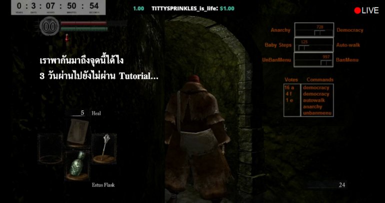 ถ้าใครจำได้เมื่อช่วงปีที่ผ่านมาก็ได้มีปรากฎการณ์หนึ่งบนเว็บไซต์ Twitch ที่ทุก ๆ คนมาช่วยกันเล่น Pokemon ในชื่อ TwitchPlayPokemon ที่ทุกคนสามารถสั่งได้ว่าตัวละครตัวนี้ต้องไปอย่างไรบ้าง และคราวนี้ก็มาถึงคิวเกม Dark Souls ...Totsapon Kritsadangphorn | 3800 days ago