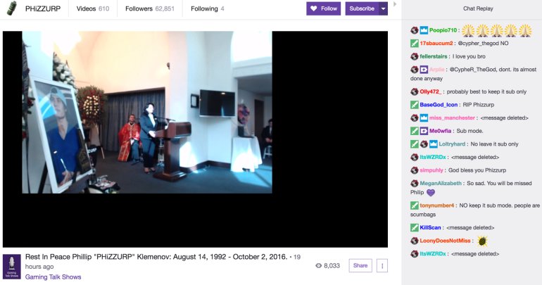 Philip Klemenov หรือชื่อในวงการ Phizzurp คือนักถ่ายทอดสดเกมบน Twitch ที่ได้จากไปก่อนวัยอันควรด้วยอุบัติเหตุทางรถยนต์ในวันที่ 2 ตุลาคมที่ผ่านมา ถึงกระนั้น การจากไปของ Phizzurp ได้แสดงให้เห็นถึงความเป็นน้ำหนึ่งใจเดียวกันของสังคมบนโลกออนไลน์ที่มีต่อช่วงเวลาแห่งการศูนย์เสีย ในงานพิธีเคารพในวันที่ 9 ตุลาคม แฟนคลับของ Phizzurp ได้ขอร้องให้ครอบครัวของเขาถ่ายทอดสดบนแชลแนล Twitch ของเขาเป็นครั้งสุดท้าย เพราะพวกเขาหลายคนไม่สามารถเดินทางไปร่วมพิธีได้ ครอบครัวของ Phizzurp จึงทำตามคำขอของแฟนคลับ ซึ่งการถ่ายทอดสดดังกล่าวนั้นได้เกิดเหตุการณ์สุดประทับใจขึ้น เพราะได้มีบรรดาแฟนคลับจำนวนมาก เข้ามาร่วมมาไว้อาลัยกับการจากไปของ Phizzurp ในการถ่ายทอดสดที่มีมากถึง 9,000 คน แม้การถ่ายทอดสดดังกล่าวจะดูเศร้าหมอง แต่อย่างน้อยก็ยังเป็นหนทางที่แฟนคลับของเขาจะสามารถแสดงความไว้อาลัยให้กับการจากไปของผู้เป็นที่รักยิ่งของเขาได้ เพราะ Phizzurp ไม่ได้แค่เพียงเล่นเกมถ่ายทอดสด แต่เขายังได้มอบทั้งเสียงหัวเราะ ความสนุกและความผูกพันธ์ให้กับแฟนๆ ซึ่งในวาระสุดท้ายของเขานั้น ได้แสดงให้เห็นแล้วว่าเขามีความสำคัญและเป็นที่จดจำกับเหล่าแฟนคลับมากแค่ไหน credit: endgadgetwarayoot chertsrichookret | 3379 days ago