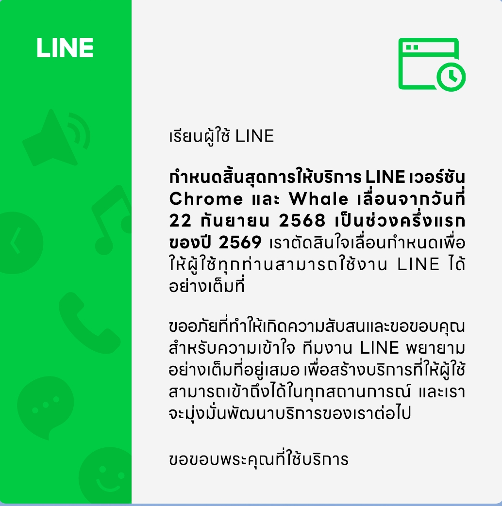 "ยุติการสนับสนุน LINE สำหรับ Chrome และ Whale (Browser Chromium based ของ Naver) ขอบคุณที่คุณสนับสนุน LINE เราต้องการแจ้งคุณว่า ตั้งแต่ 22 กันยายน 2025 (ประกาศฉบับใหม่เปลี่ยนเป็น 27 สิงหาคม 2025 จนถึงช่วงแรกของปี 2026) LINE เวอร์ชัน Chrome และ Whale Extension จะไม่สามารถใช้งานได้อีกต่อไป เนื่องจากเรายุติให้การสนับสนุนการให้บริการดังกล่าว โดยให้ผู้ให้ดาวน์โหลดเวอร์ชัน PC, มือถือ, แท็บเล็ต เท่านั้น เพื่อใช้งานต่อ"