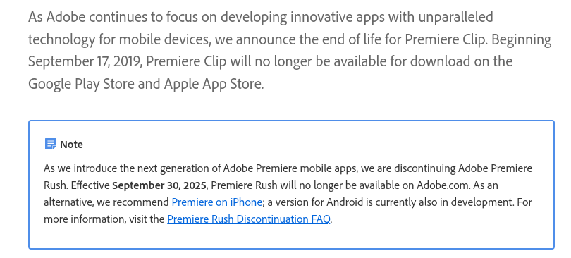 แน่นอนว่าการมาของแอปฯ นี้จะมีความสามารถมากกว่าแอปฯ เดิม ๆ และทดแทนแอปฯ เดิม โดย Adobe แจ้งจะยุติการสนับสนุนและพัฒนาแอปฯ Adobe Premiere Clip และ Adobe Premiere Rush ในวันที่ 30 กันยายนนี้ โดยจะไม่มีให้ดาวน์โหลดอีกต่อไป และจะไม่สามารถใช้งานได้แม้ติดตั้งอยู่ก่อนหน้านี้แล้ว