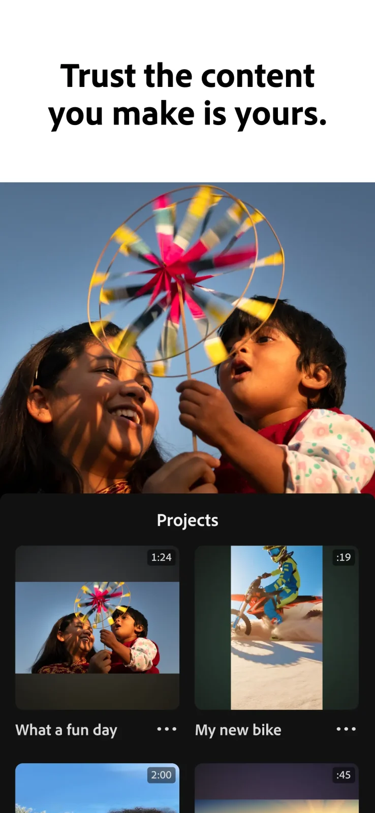 - Adobe Firefly และ Adobe Stock ในตัว เพียงอธิบายภาพหรือเสียง รวมถึงไอเดีย ก็สามารถเลือกนำมาใช้ในงานได้ ทั้งเพลงและเสียงเอฟเฟกต์ไปจนถึงรูปภาพ กราฟิก และวิดีโอ โดยสามารถใช้งานเชิงพาณิชย์หรือประกอบการงานที่ใช้หารายได้ได้ และได้รับอนุญาตจากเจ้าของผู้สร้างสรรค์