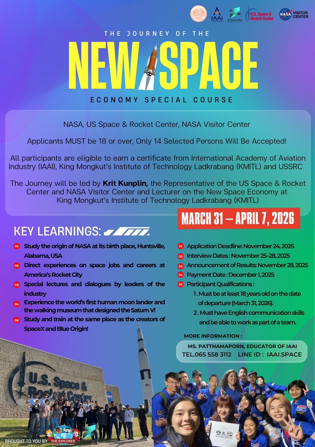 เตรียมตัวให้พร้อม ! นี่ไม่ใช่แค่การเดินทาง แต่คือภารกิจครั้งประวัติศาสตร์ที่จะพาคุณทะยานสู่ใจกลางอุตสาหกรรมอวกาศของโลก กับคอร์สสุดพิเศษ THE JOURNEY OF THE NEW SPACE ECONOMY ที่จะเปิดประตูให้คุณได้เรียนรู้ เยี่ยมชม และฝึกฝนในสถานที่จริง ณ US Space & Rocket Center (USSRC), มหาวิทยาลัย Alabama in Huntsville (UAH) และ NASA Visitor Center
