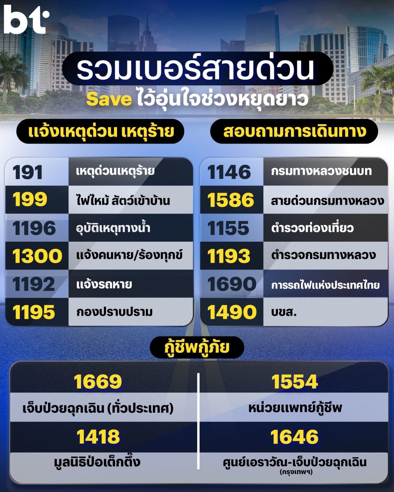 หยุดยาวนี้ใครมีแพลนเดินทางไกล หรือต้องขับรถไปต่างจังหวัด BT beartai อยากให้ทุกคนเดินทางอย่างไม่ประมาท แนะนำให้เซฟเบอร์ฉุกเฉิน-สายด่วนสำคัญติดเครื่องไว้ เพราะเหตุไม่คาดฝันเกิดขึ้นได้เสมอ เราเลยมัดรวมเบอร์ที่จำเป็นมาให้แล้ว เซฟไว้เลย !