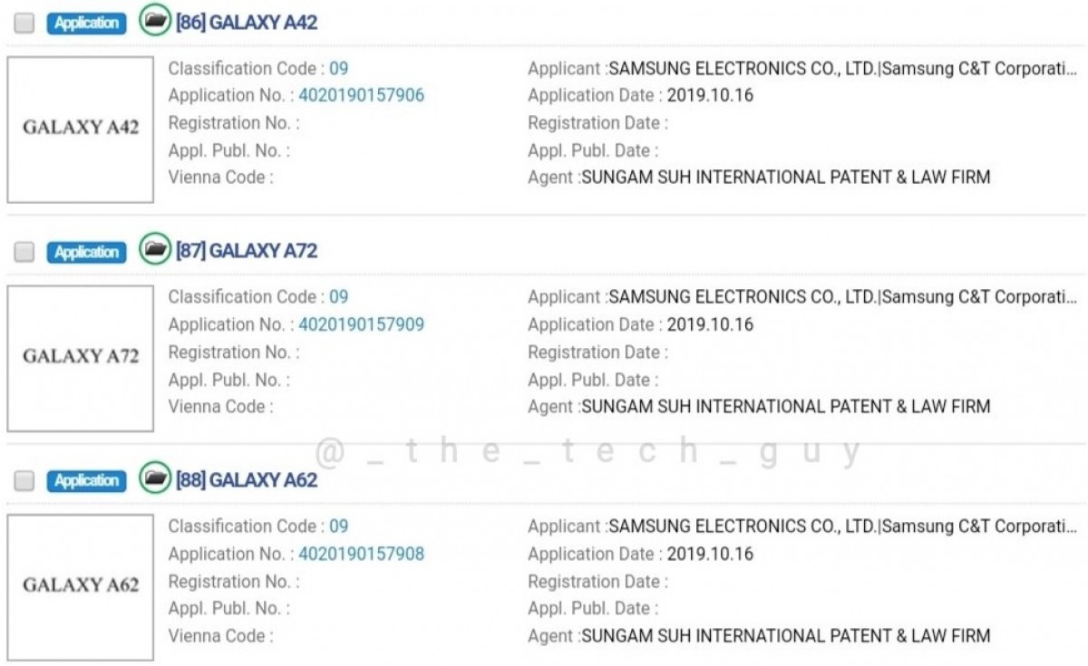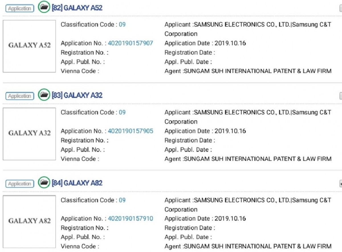 สำหรับปี 2020 นี้ ดูเหมือน Samsung จะยังคงเดินหน้าพัฒนาสมาร์ตโฟนซีรีส์ Galaxy A ต่อไป โดยล่าสุดได้มีการเปิดเผยว่า Samsung ได้ยื่นจดสิทธิบัตรสมาร์ตโฟนซีรีส์ Galaxy A รุ่นใหม่ ในประเทศเกาหลีใต้มากถึง 9 รุ่นด้วยกัน ดังนี้