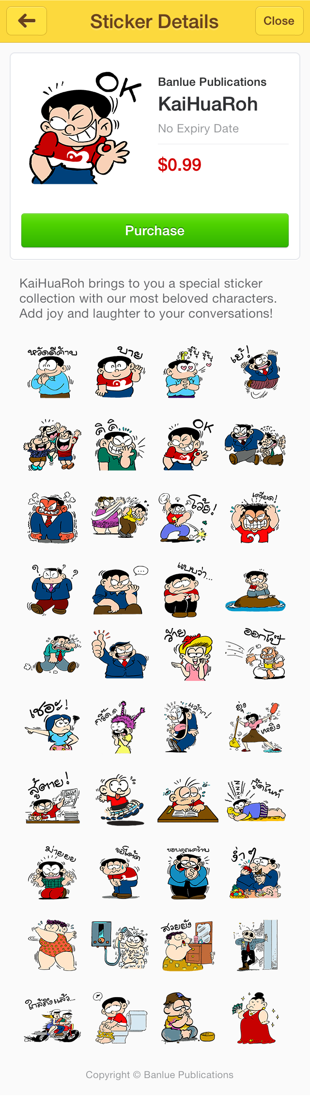 Sticker ขายหัวเราะ โดดเด่นในด้านการเพิ่มสีสันให้บทสนทนาของผู้ใช้ มีบรรยากาศที่สนุกสนานผ่อนคลาย ไม่ตึงเครียด และเป็นมิตร โดย Sticker แต่ละตัวถูกถ่ายทอดผ่านลายเส้นฮาๆ อันคุ้นเคยของ พี่ต่าย – ภักดี นักเขียนการ์ตูนขวัญใจมหาชน ซึ่งนอกจากจะแฝงอารมณ์ขันไว้อย่างเต็มเปี่ยมแล้ว ฟังก์ชั่นของสติกเกอร์ยังถูกออกแบบมาให้เหมาะสมกับไลฟ์สไตล์คนไทยยุคใหม่ โดยเราออกแบบให้ Sticker ชุดนี้ครอบคลุมทุกฟังก์ชั่นการใช้งาน ทุกอารมณ์ แต่คงไว้ซึ่งอารมณ์ขันแบบไม่ธรรมดา โดยรวบรวมสถานการณ์ที่น่าจะถูกใช้เป็น Sticker มากที่สุด รวมถึงมู้ดแอนด์โทนแบบ “สุดๆ” ซึ่ง Sticker แบรนด์อื่นไม่มี เช่น Sticker คนซ้อนวินมอเตอร์ไซด์ “ใกล้ถึงแล้ว” สามารถใช้ได้เวลาเรากำลังฝ่าจราจรอันติดขัดไปทำงาน, Sticker “รออยู่นะ” สำหรับคนที่ต้องรอนัดนานๆ จนหยากไย่ขึ้น, Sticker “ภรรยาขาโหดและสามี” รวมถึงสารพัดข้อความและอารมณ์ที่ถูกสะท้อนออกมาน่ารักๆ แบบจัดจ้านสไตล์ “ขายหัวเราะ” ไม่ว่าจะเป็นทักทาย รัก ดีใจ โกรธ งอน รวย จน ขอบคุณ ขอโทษ ชมเชย กิน อาบน้ำ ฯลฯ ทุกตัวล้วนออกแบบมาให้ทั้งตลก เฮฮา และสื่ออารมณ์ของผู้ใช้ได้เป็นอย่างดี รวมไว้แล้วในคอลเลคชั่น Sticker ขายหัวเราะ ชุดมาตรฐาน จัดเต็มชุดใหญ่ 40 ตัวในราคาสบายกระเป๋า ด้วยราคาเพียง $ 0.99 เท่านั้น