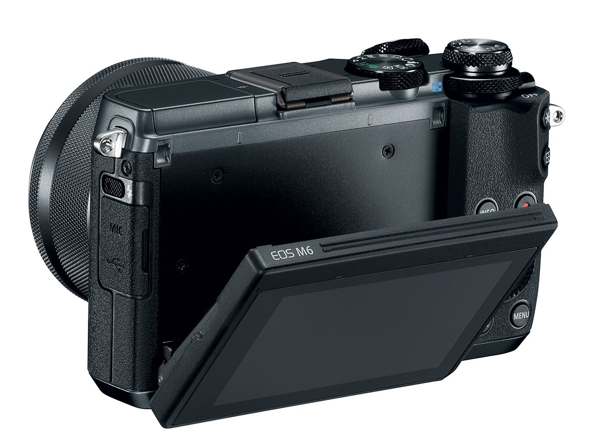 - Canon EOS M5 จอภาพ LCD จะพับลง ในส่วนของ Canon EOS M6 จอภาพ LCD จะพับขึ้น