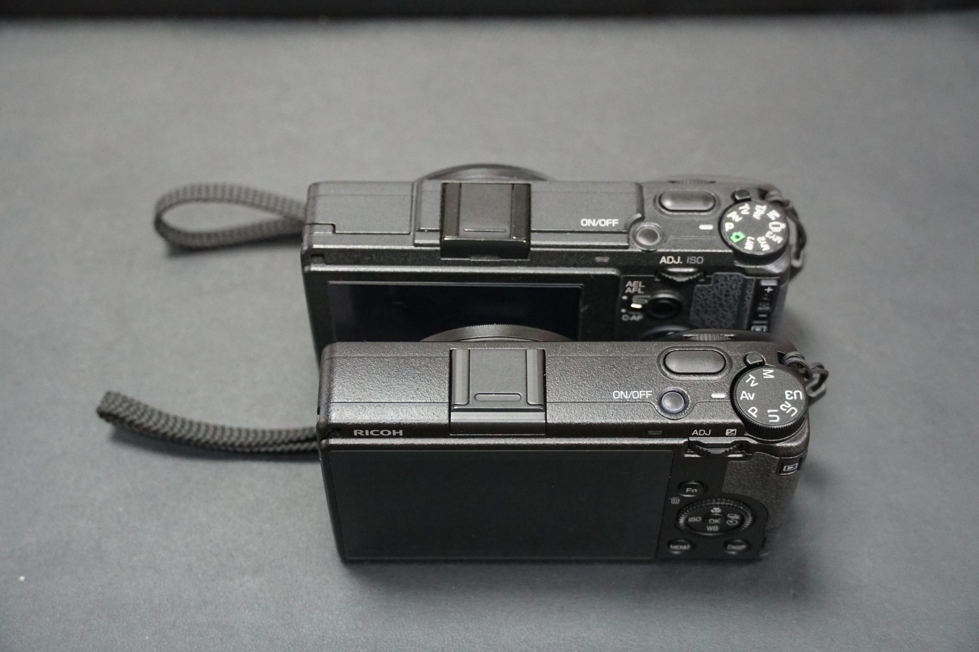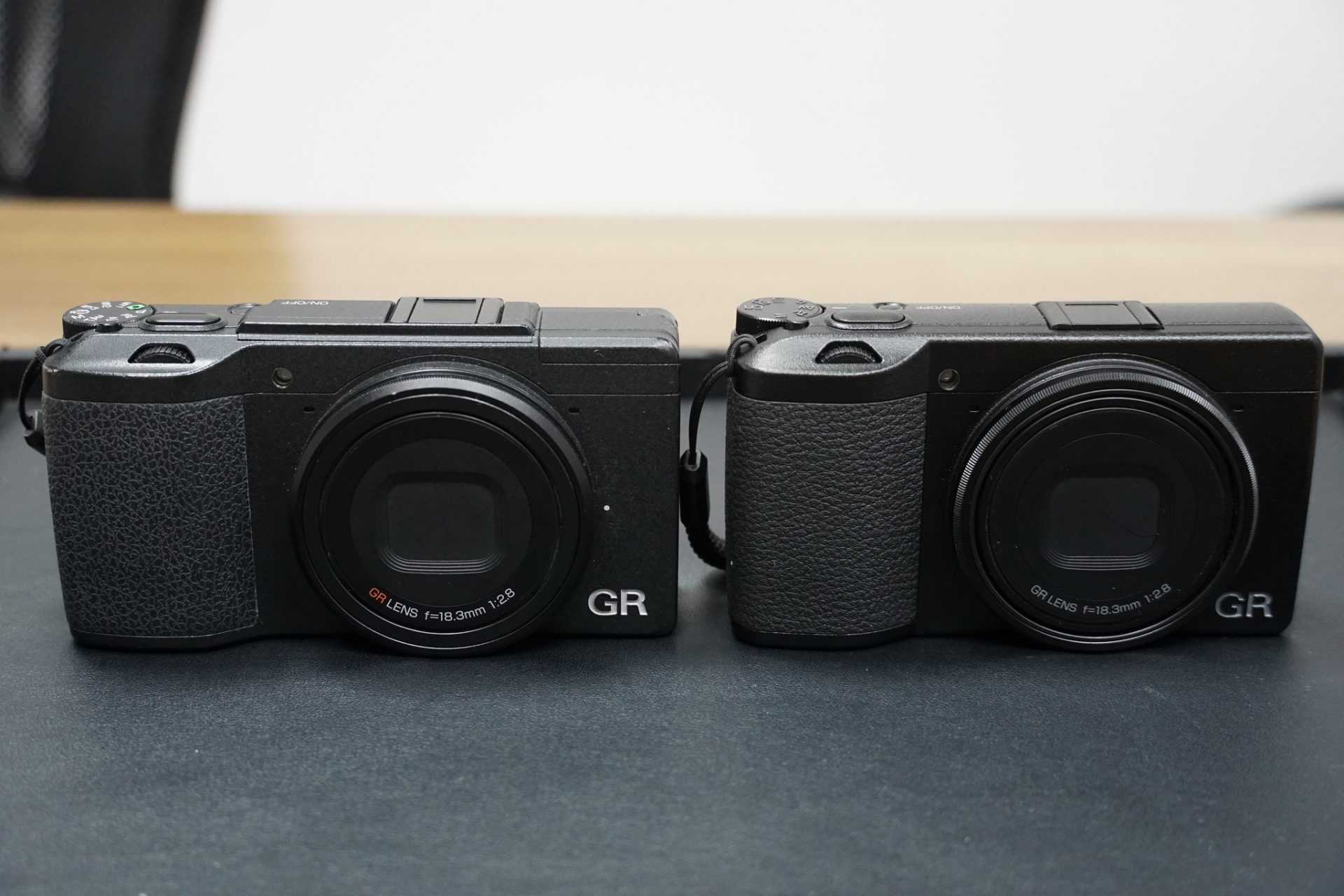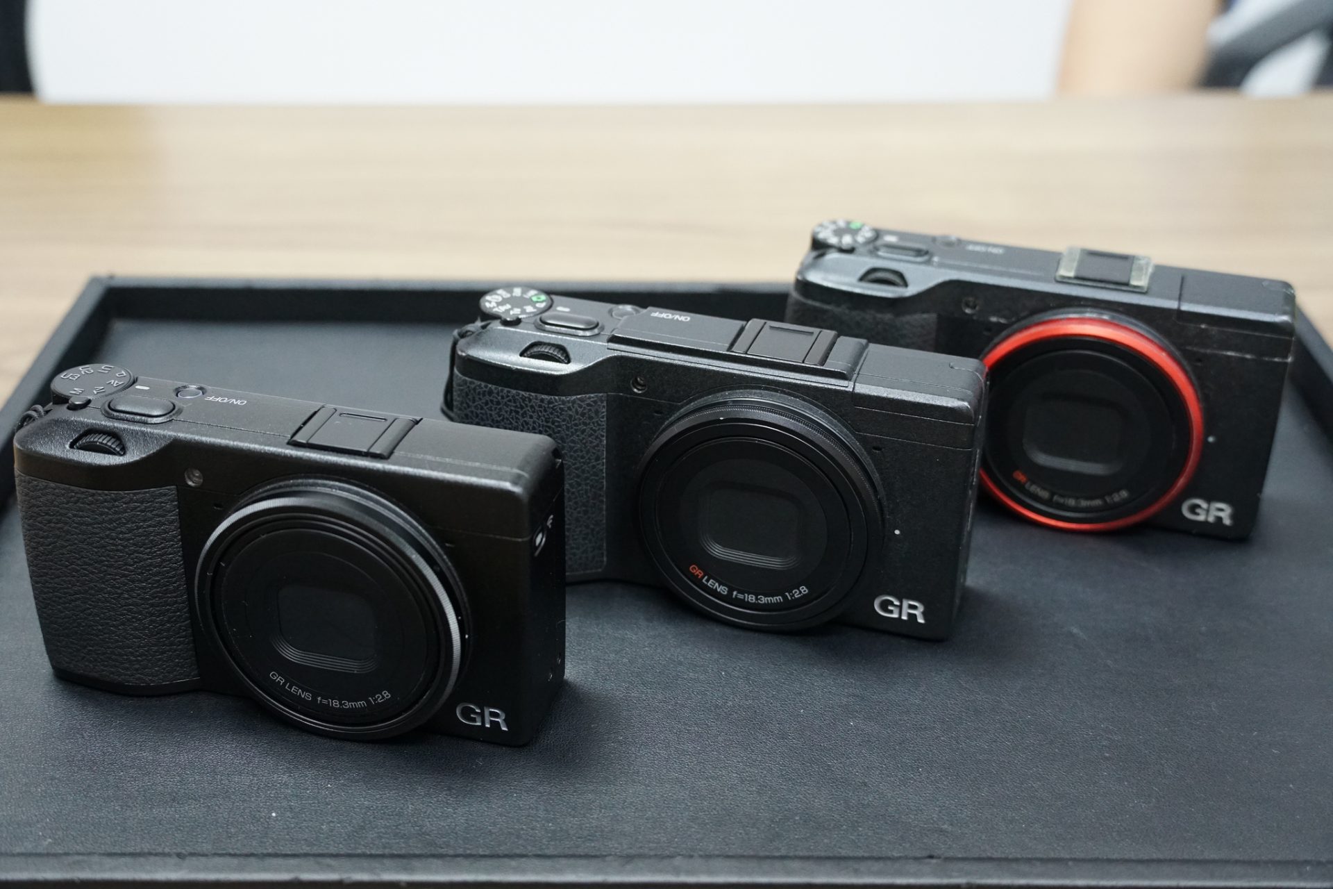 จากหน้าคือ Ricoh GR III, GR II และตัวขอบแดงคือ Ricoh GR
