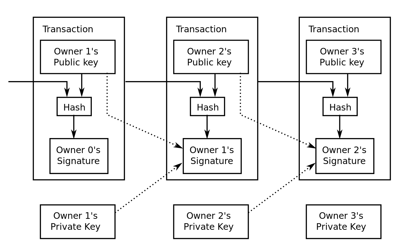 ระบบการทำงานแบบกระจายศูนย์ของ Bitcoin ที่สร้างการทำธุรกรรมโดยใช้คีย์สาธารณะและคีย์ส่วนบุคคล เมื่อผู้ใช้ตัดสินใจที่จะส่งเงิน Bitcoin ให้บุคคลอื่น ผู้ใช้จะสร้างข้อความอิเล็กทรอนิกส์ที่สามารถรับรองความถูกต้องจากคีย์ (key หรือกุญแจ)