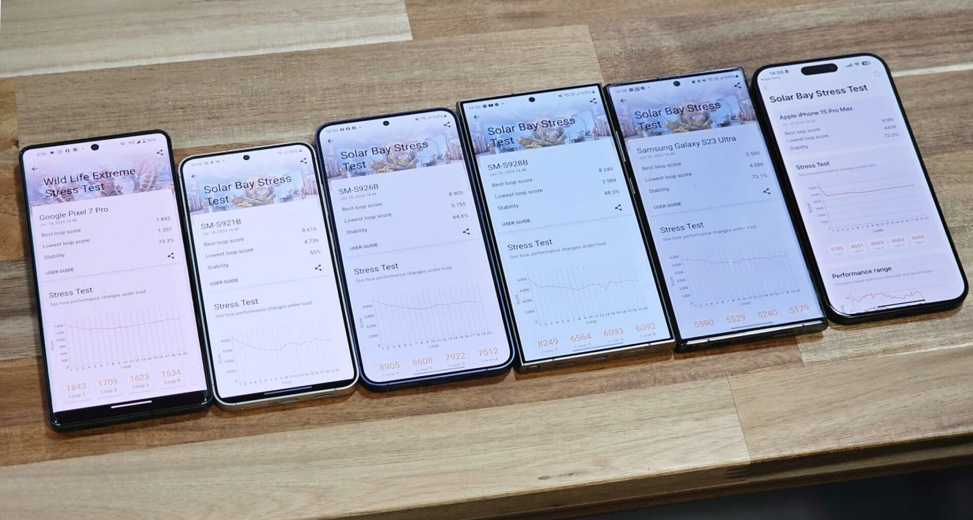 ในส่วนของคะแนนต่ำสุดของแต่ละเครื่องที่ทำได้ S24 Plus ที่ใช้ชิป Exynos 2400 คือรุ่นที่ทำ Stability ได้ดีที่สุด ได้คะแนนในพาร์ต Stability ไปถึง 63.8% มากกว่า S24 Ultra ที่ใช้ Snapdragon 8 Gen 3 ที่ 50.3% จึงทำให้ S24 Plus ได้คะแนนในรอบต่ำสุด สูงที่สุดที่ 9,224 คะแนน แบตหายไป 13% อุณหภูมิอยู่ที่ 26 องศา – 46 องศา ร้อนกว่า Snapdragon 8 Gen 3 เพียง 3% (แต่ในเรื่อง Stability ดีกว่าเยอะมาก) แต่จากที่เราเทสต์กัน ตัว iPhone 15 Pro Max จะได้คะแนนเทสต์เยอะสุดในพาร์ตนี้ แต่ยังแพ้คะแนน Stability ให้กับ S24 Plus เพราะได้คะแนนเทสต์สูงสุดมาก แล้วพอเจอความร้อนประสิทธิภาพก็ลดลงเป็นสัดส่วนที่สูงกว่า