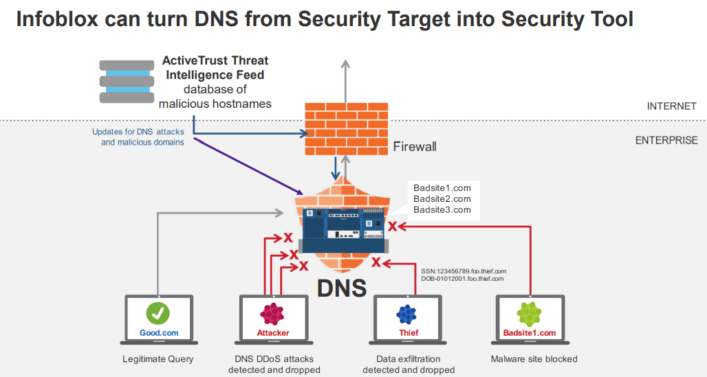 วิธีแรก ถ้าเป็นมัลแวร์ที่โลกโดนมาก่อนแล้ว ทีมวิจัยของ infoblox จะอัปเดทฐานข้อมูล url ที่ไม่ดีภายใน 2 ชั่วโมง ถ้ามีมัลแวร์จะเรียกหาเว็บที่ไม่ดี อยู่ในฐานข้อมูลของ infoblox ก็จะไม่ตอบ ip กลับไป มันก็เหมือนอินเทอร์เน็ตล่มสำหรับเว็บนั้น