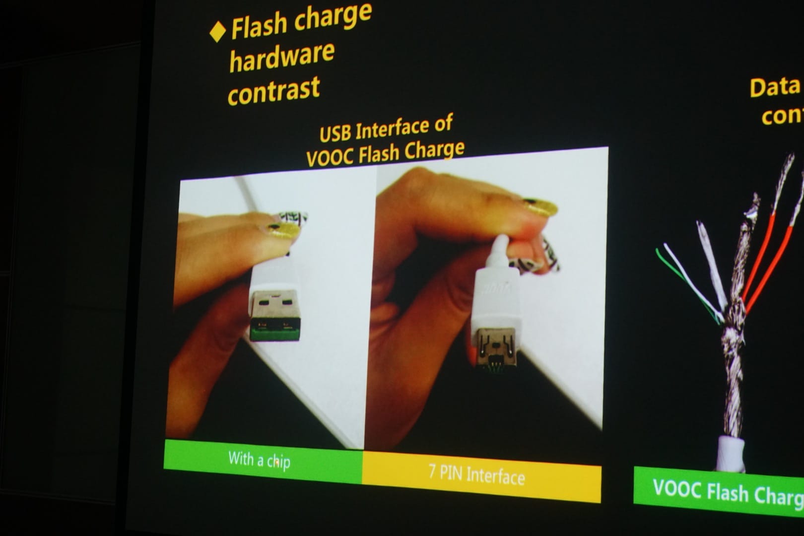 เบื้องหลังเทคโนโลยี VOOC Flash Charge คือการออกแบบหัวชาร์จและสายชาร์จใหม่ เพิ่มจำนวนสายทองแดงและพินที่ปลายหัว USB เข้าไป จากปกติที่มีแค่ 4 พินก็เพิ่มเป็น 7 พิน และเสริมความหนาของสายไฟเข้าไปทำให้รองรับกระแสที่เพิ่มมากขึ้นของ VOOC ได้ โดย VOOC Flash Charge นั้นใช้กระแสระดับ 5V 4A ซึ่งสูงกว่าหัวชาร์จมาตรฐานที่ใช้กระแส 5V 1A ถึง 4 เท่านั้นเอง