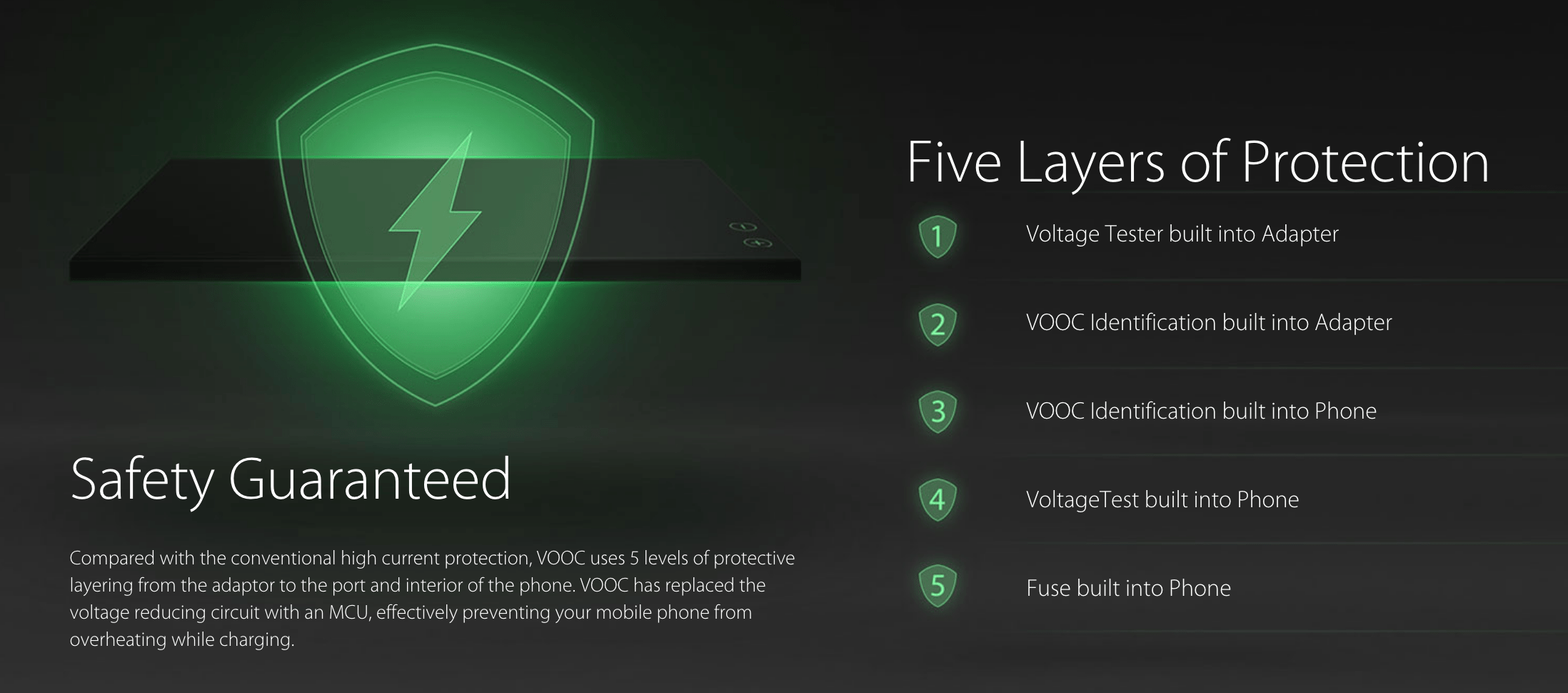แน่นอนว่าการพัฒนาเทคโนโลยีที่เกี่ยวกับไฟฟ้า เรื่องความปลอดภัยก็เป็นเรื่องสำคัญ เรารู้แล้วว่าสายชาร์จแบบพิเศษของ VOOC มีพินเชื่อมต่อและสายไฟที่หนากว่าปกติ แต่ OPPO VOOC Flash Charge ก็ต้องมีมาตรฐานเสริมความปลอดภัยเพิ่มเติมอีก 5 ขั้นคือ