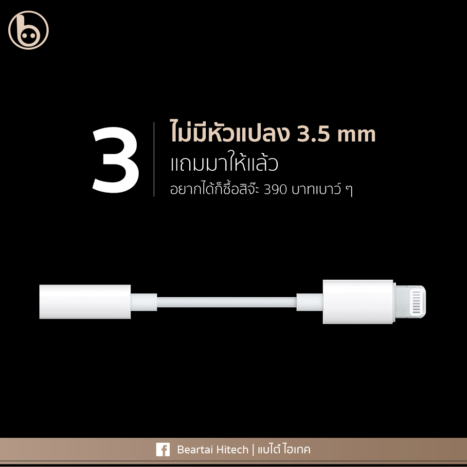 ซึ่งตอนแรกแอปเปิ้ลก็ทำแบบค่อยเป็นค่อยไปโดยแถมสายแปลง Lighting เป็น 3.5 mm อยู่ แต่ iPhone ชุดใหม่ที่ขายในปีนี้ดันไม่แถมสายตัวนี้แล้วครับ ผู้ใช้ก็ต้องใช้ EarPods แบบ Lighting ที่แถมให้ในกล่อง หรือก็ต้องหาซื้อหูฟังไร้สายมาใช้แทน หรือถ้าจะซื้อหัวแปลงตัวนี้ แอปเปิ้ลก็ยังขายในราคา 390 บาทนะ คุณบร๊ะ