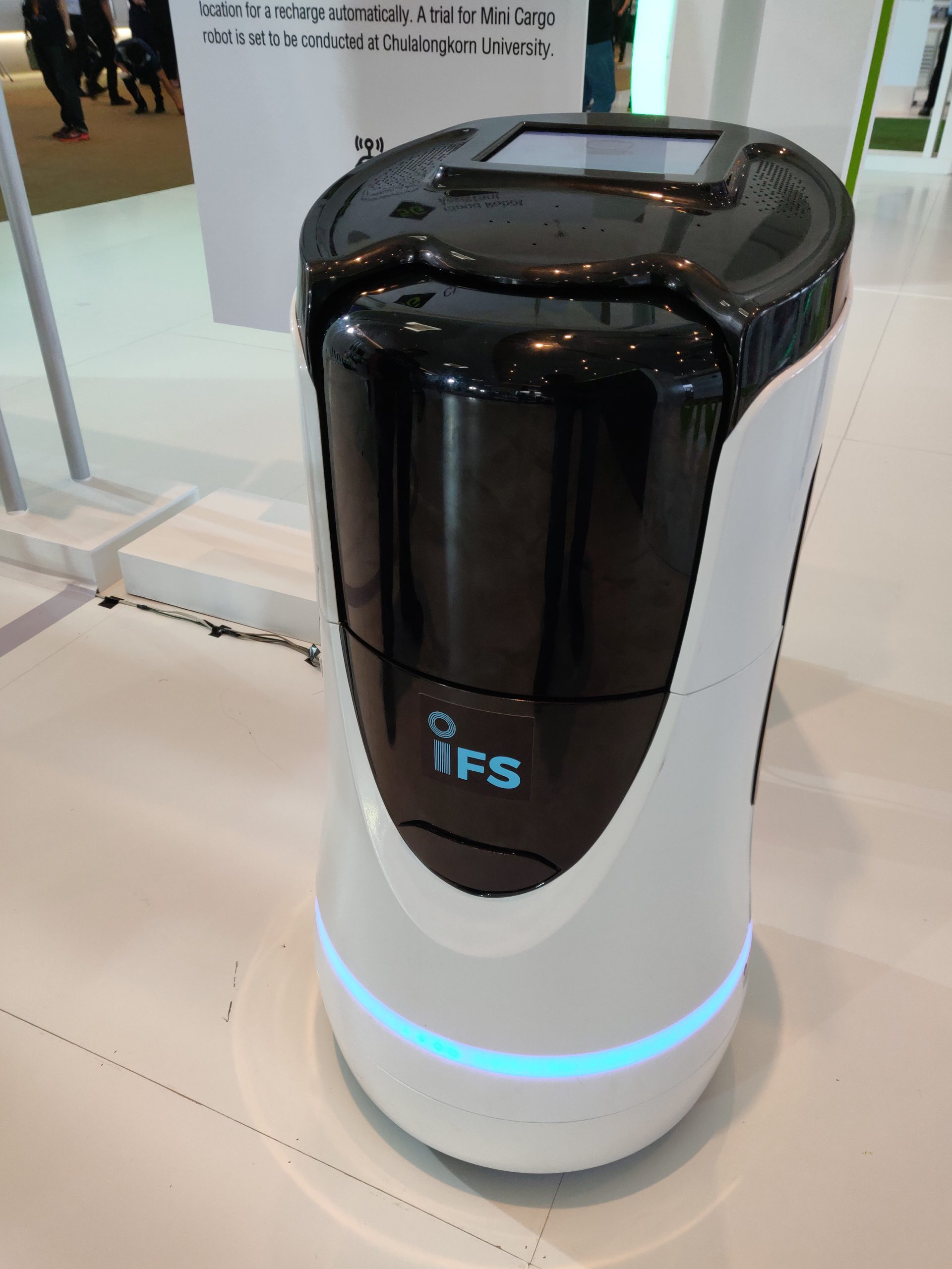 ในงานนี้มีหุ่นยนต์มาโชว์เยอะมากครับ เริ่มตั้งแต่ Robot Mini Cargo หุ่นยนต์ช่วยเดินเอกสารที่ทำงานผ่านระบบ 5G ช่วยให้การเดินเอกสาร, ส่งของต่างๆ ในอาคารง่ายขึ้น โดยสามารถเดินไปยังเป้าหมายที่ระบุพร้อมสามารถหลบหลีกสิ่งกีดขวางได้โดยอัตโนมัติ เมื่อทำงานเสร็จก็เคลื่อนที่กลับมาตำแหน่งชาร์จพลังงานเองได้ โดยจะมีการทดลองใช้หุ่นยนต์ Mini Cargo ในบริเวณจุฬาลงกรณ์มหาวิทยาลัย