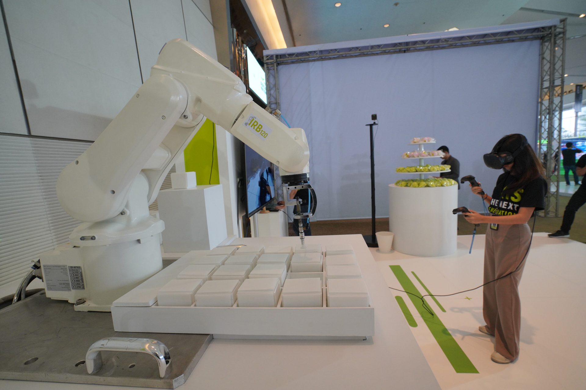 IRB-120 หุ่นอุตสาหกรรม เพื่อโชว์สามารถของหุ่นยนต์แขนกลที่สามารถควบคุมการทำงานระยะไกลผ่านเครือข่าย เพื่อช่วยให้มนุษย์ไม่ต้องเข้าไปในพื้นที่เสี่ยง โดยในครั้งนี้เป็นการสาธิตผ่านการเล่นเกมหยิบกล่องนำโชค โดยผู้เล่นจะสวมแว่น VR และใช้แป้นควบคุมการทำงานของหุ่นยนต์เพื่อหยิบกล่องนำโชคลุ้นรับของรางวัล