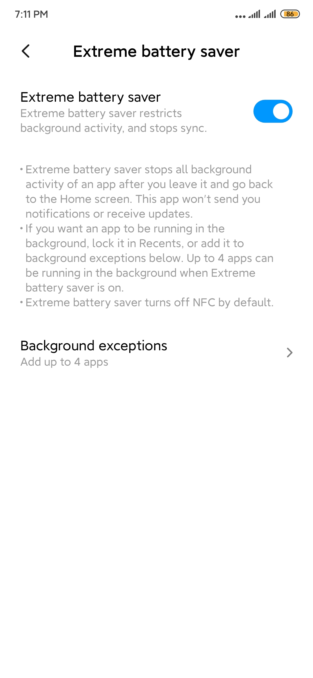 เมื่อทำการเปิดโหมดนี้ จะทำให้เครื่องปิด background process ของทุกแอปทิ้งทันที แต่เรายังสามารถเลือกเก็บไว้ได้สูงสุด 4 แอปให้ทำงานต่อไป ซึ่งทาง Xiaomi เค้าเคลมเอาไว้ว่า แบตเพียง 5% จะสามารถ standby ได้นานถึง 24 ชั่วโมงเลยทีเดียว