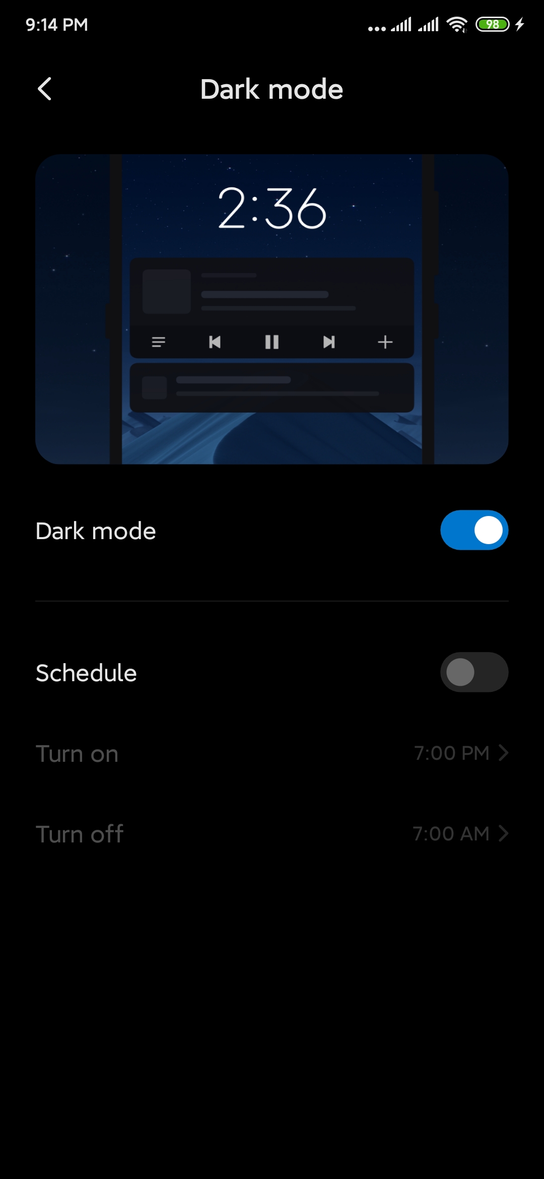 หนึ่งในฟีเจอร์พื้นฐานตั้งแต่ Android Pie 9.0 คือ Dark Mode โดยตอนนี้ได้ถูกใส่เข้ามาใน MIUI11 แล้วอย่างเต็มตัว สามารถกำหนดเวลาให้เปิดใช้งานเฉพาะช่วงได้ด้วย โดยเมื่อเปิดใช้จะทำให้ Quick Setting, แอป Setting และ แอปที่ pre-loads มากับเครื่องส่วนใหญ่เปลี่ยนเป็น Dark Theme ด้วย