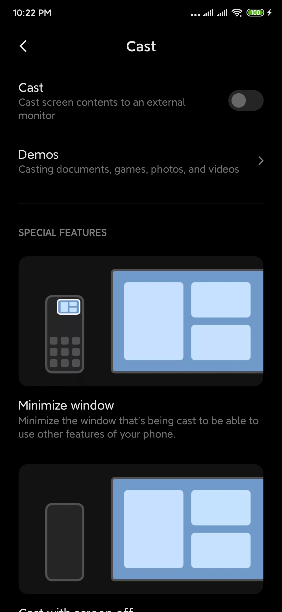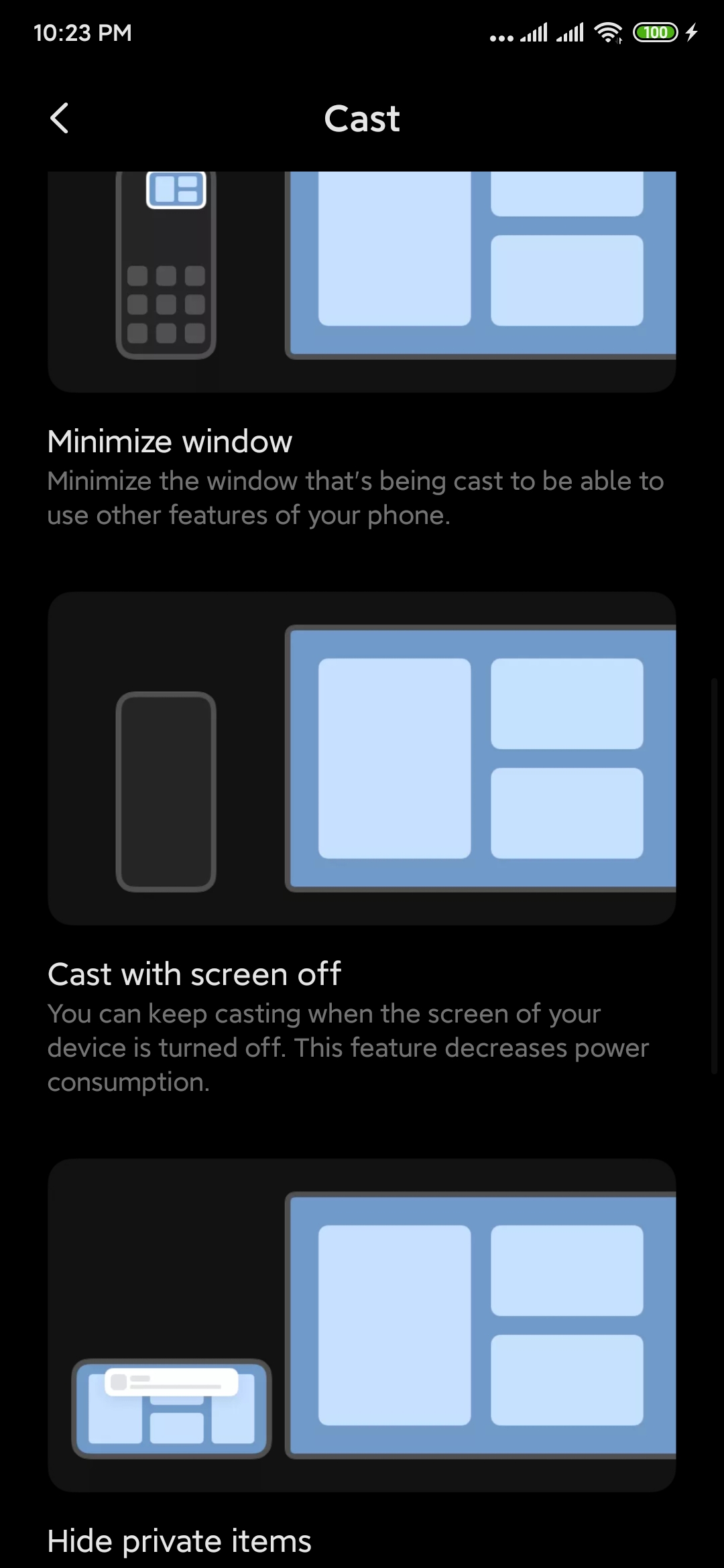 สามารถตั้งค่าการ cast หน้าจอได้หลากหลายและมีประโยชน์มากขึ้น เช่นการ Cast จอแค่บางส่วนของจอ, การ Cast จอไปออก external display แล้วปิดจอหลักของเครื่องเอาไว้ และการซ่อน Notifications ขณะ casting