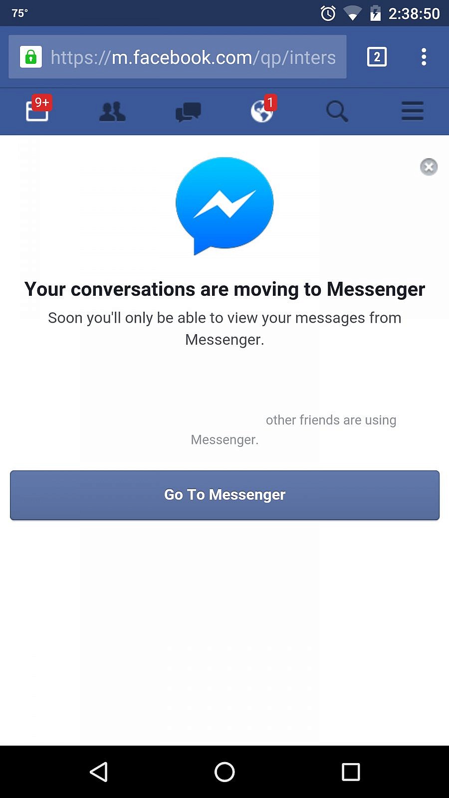 ก่อนหน้านี้ผู้ใช้ก็สามารถหลีกเลี่ยงการที่จะโดนบังคับ โดยไปใช้หน้า Mobile-Site ของ Facebook เพื่อใช้งานแชตผ่านหน้าเว็บแทน แต่ล่าสุดเมื่อเข้าไปใช้งานแชตผ่านหน้า Mobile-Site นั้น กลับพบข้อความให้เปลี่ยนไปใช้ Messenger แทน