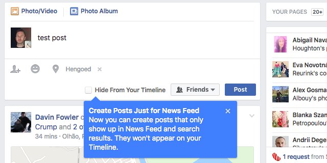 มีผู้ใช้บางคนได้พบว่าในขณะนี้ Facebook กำลังทดสอบฟีเจอร์ใหม่อยู่ คือตัวเลือกในการโพสต์สถานะลง News Feed อย่างเดียว ซ่อนโพสต์จาก Timeline