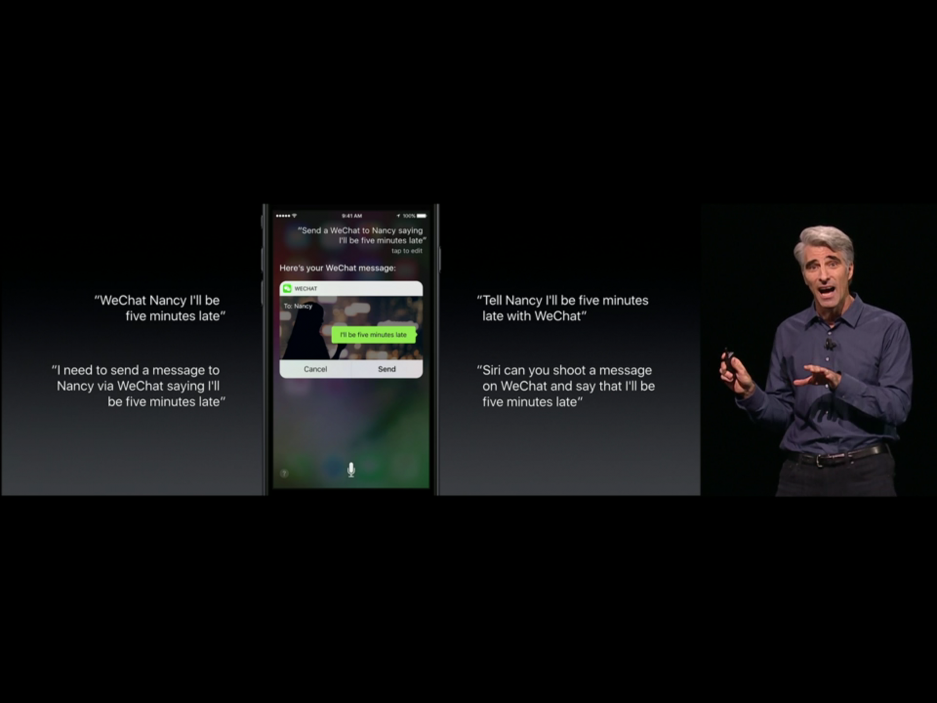 ในตอนนี้นักพัฒนาแอปสามารถเข้าถึง Siri เพื่อให้ตัว Siri สามารถถูกเรียกใช้งานได้สะดวกผ่านแอปของตัวเองได้โดยตรงโดยที่ไม่ต้องเปิดไปที่แอปโดยตรง เช่น การเรียกรถจาก Uber การส่งข้อความไปที่ Line ก็สามารถทำได้แล้ว
